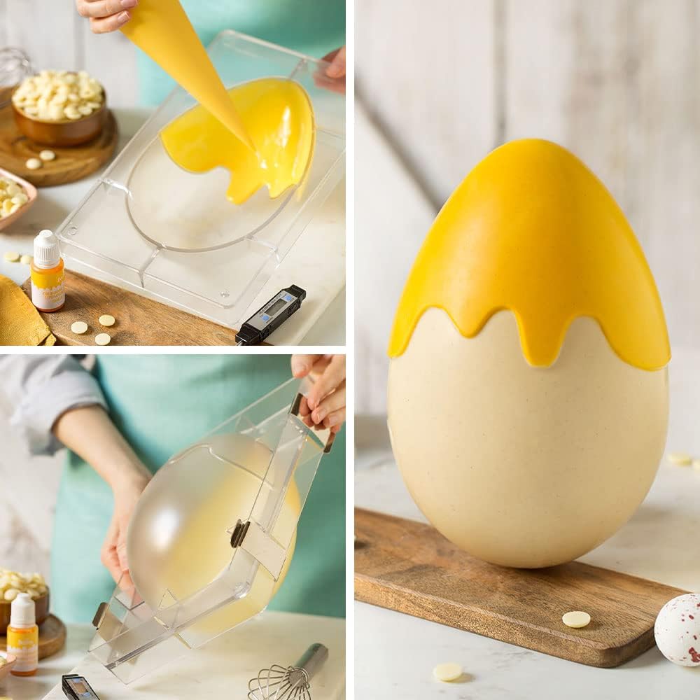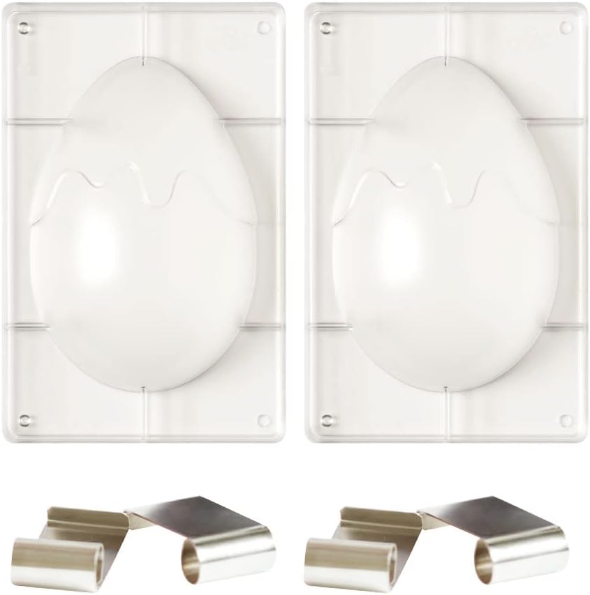 Size: 250 g - cavity 135 x 205 x 75 h mm - Mould 275 x 175 x 22 h mm Kit consisting of 2 polycarbonate egg molds and 4 chrome springs, perfect for making chocolate eggs with one step. Practice the brochure with a step inside. If you want to get colored eggs, brush the mold with the fat-soluble dye or add it to the melted chocolate. You can also paint floral patterns or abstract decorations. Have fun customizing eggs with roofs on the real ice crescent or using ready-made sugar decorations. How to do it: Chocolate correctly, pour it into one of the two cavities, overlap the second mold and fix it to the other using the chrome springs. With the movements of the rotators, distribute the chocolate on the surface of the two molds. Let it cool preferably at a temperature of 19°/23°C for about 30 minutes before removing the whole egg.