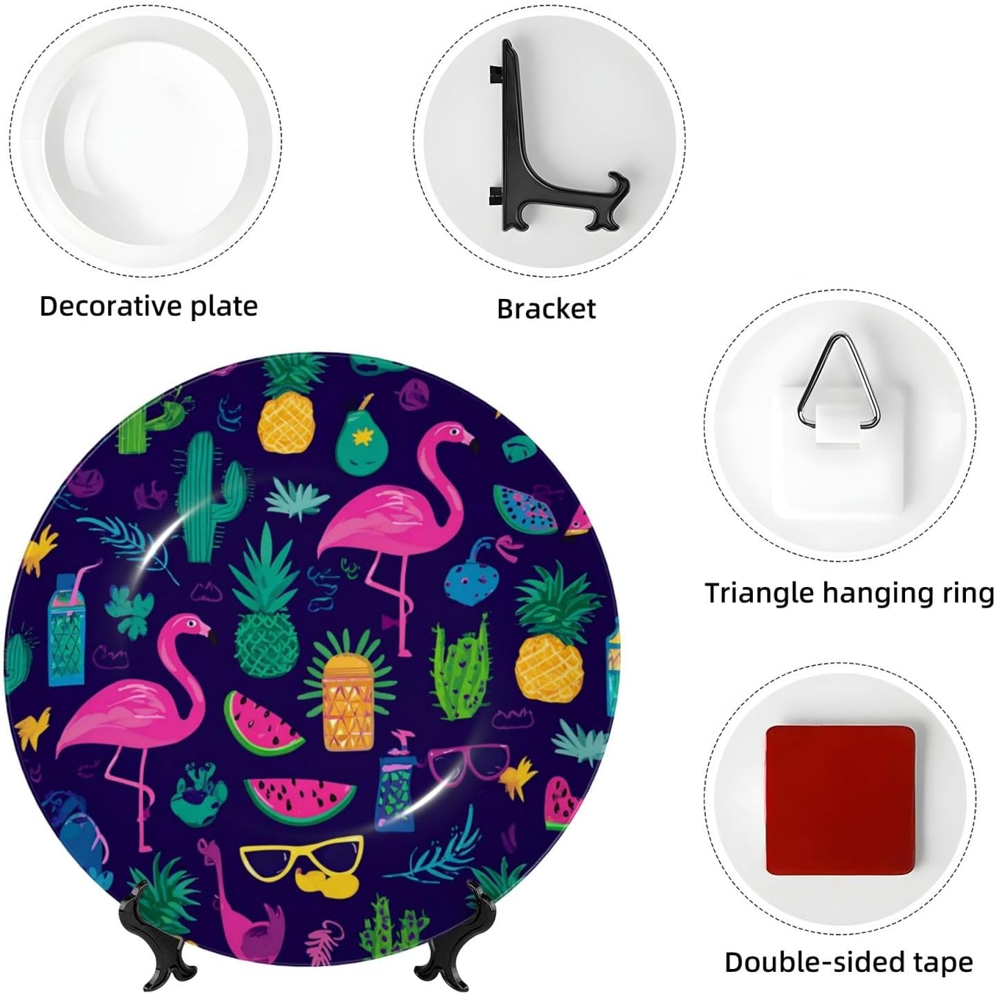gokays decorative platedo you feel that your table is monotonous? Then use our decorative plate to add a little fun to the monotony of life.featuressize - 6 inch diameter;7 inch diameter;8 inch diameter;10 inch diametermaterial - ceramic design - Banana Flamingo package - 1 x ceramic decorative plate, 1 x stand, 1 x pothookwhy choose gokays decorative plates?advantageas manufacturers we follow current trends and bring you the latest home fashion. Salad plates ideal for placement at home or in the office. Traditional porcelain making technology, fine workmanship. Ceramic dinner plates is a good gift for family and friends.convenient to useour dinner plates rack for display has 2 ways to use, you can just place the bracket base on a flat surface first, and then put the plate on it, also you can stick the provided pothook at the back of the plate, and then stick the plate on the wall, you can choose the suitable installation method according to the actual situation.occasionour ceramic ornaments salad plates is a perfect decorative and collection for any niche, table, or mantle at your home. Perfect for your office, home, living room, dining room, playroom, kitchen, cafe, study, studio, club, bar, and others.in a surprise for your family and friends!porcelain dessert plates is a perfect gift for any person in your life. You can give it directly to your lover as mother's day gift/father's day gift/birthday gift/christmas gift/valentines day gift/anniversary gift/wedding gift/housewarming gift/new home gift.start with our funny decorative plate, refresh your rooms!