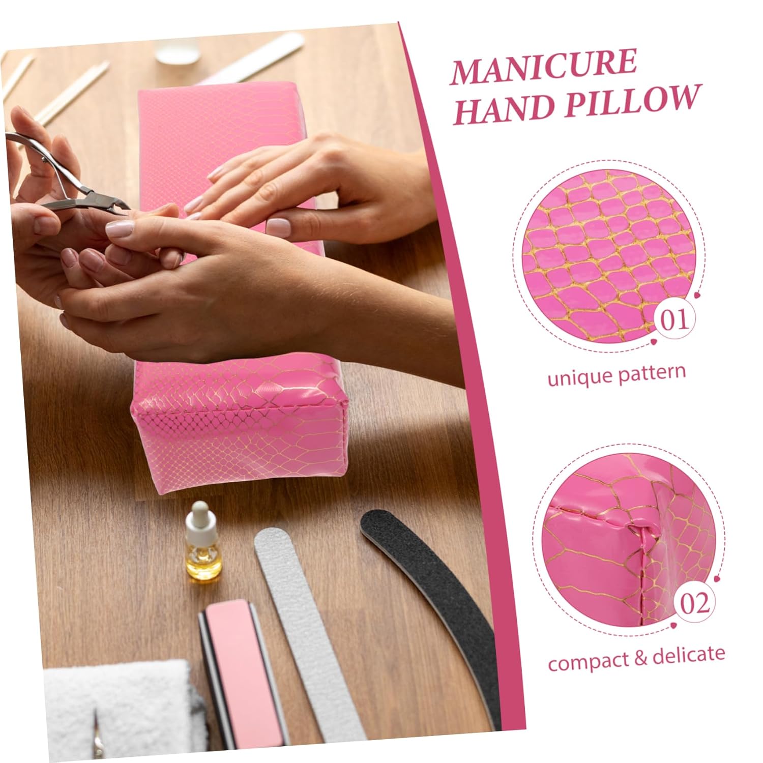 Package List 1 x Nail Rest Pillow 1 x Mat Features -Color:Pink manicure hand cushion -Size:30.00X9.70X6.50cm/11.79X3.81X2.55in arm rest -Material:PU leather,sponge nail art hand pad -Size:37.00X29.00X0.50cm/14.54X11.40X0.20in hand rest for manicure -Experience unparalleled comfort and support during your nail with the material of this nail pillow hand rest. -This multifunctional nail pillow is for various nail art techniques and hand treatments, making it a versatile tool for any nail technician or home user arm rest for nails. -The cleaning and maintenance is effortless, ensuring that your nail pillow stays in condition for longer nails hand rest. -Make a bold statement with the eye-catching design that adds a trendy touch to any nail station nail arm rest pillow. -Whether you're a busy on-the-go nail technician or home user, this nail pillow is the accessory to take with you wherever you go hand rest for nails.Goods Descriptionnail art arm rests Enhance your nail art experience with the Manicure Hand Pillow.nail hand rest pillow Its compact and lightweight design makes it for on-the-go nail technicians or home users.nail arm rest for nail salon This multi-functional hand pillow is suitable for various nail art techniques and hand treatments.nail art rest cushion The eye-catching design adds a trendy and stylish element to your nail station.hand rest for manicure It provides superior comfort and support for your hands