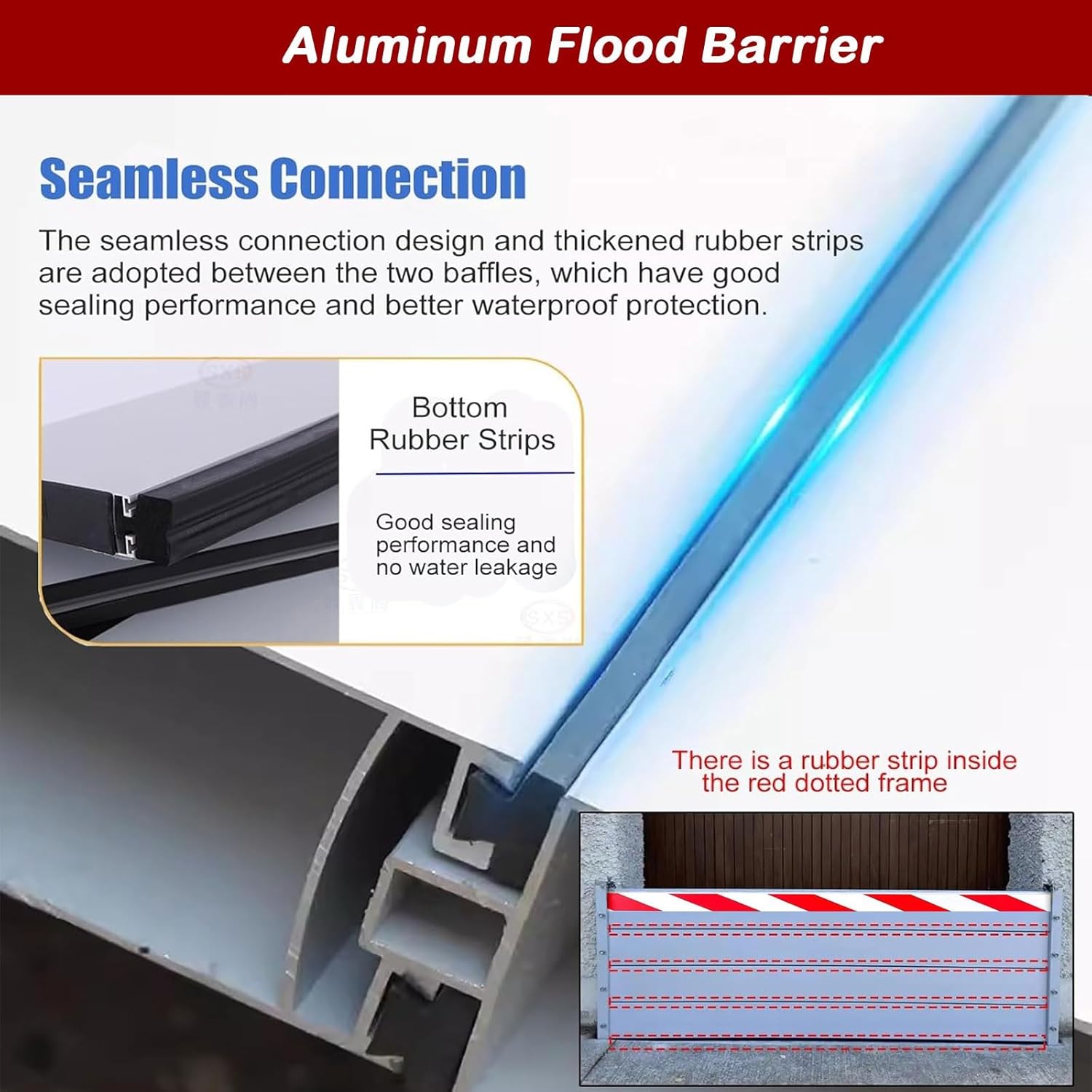 Product description:Wide range of applications: Our flood barriers are excellent tools for flood control, disaster preparedness and erosion control. Widely used in doorways, garages, roads, dams during rainy seasons or hurricanes, and can also be used for temporary water storage.Can also prevent mice and animals from enteringProduct specifications:Product name: Flood control gateMaterial: aluminum alloySingle board height: The height of a single water retaining board is 20cm, which can be stacked for useSize: Available in a variety of sizesTwo installation methods:E: Exterior, distance between two walls + 20cmI: Interior, measure the distance between two wallsScope of application: Flood control sites such as rivers, reservoirs, and water conservancy projects. It can also be used in temporary protection sites such as construction sites and road construction. Can be used for house entrances, garage exits, etc.feature:1. Installation and disassembly save time and effort;2. Strong sealing performance;3. Waterproof, sturdy, wear-resistant and impact-resistant;4. Reflective warning strip, strong safety.Packaging contents:1* Door Flood BarrierHint:1. Due to different monitors and lighting effects, the actual color of the item may be slightly different from the color shown on the picture. Thanks!2. Due to manual measurement, please avoid 1-3cm measurement deviation.