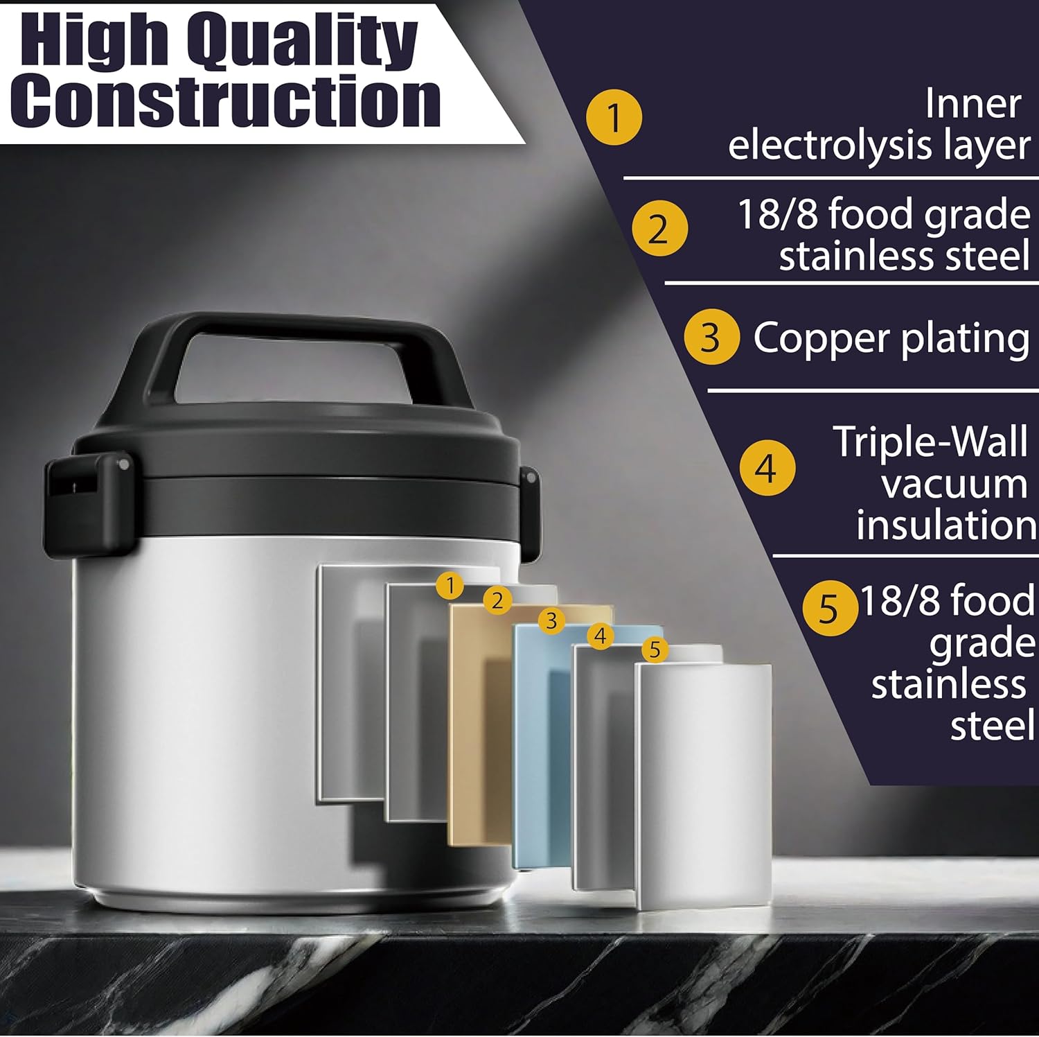 | Additional Features | Built to Endure Use Anywhere – Rugged 18/8 food-grade steel resists wear and odors; BPA-free lids, wide-mouth opening simplifies filling, serving, and cleanup. Airtight locking lid with silicone ring prevents messes and secures freshness during transport or storage., Carry and Go With Ease – Textured base provides stable placement, and integrated handle allows effortless portability on hikes, trips, lunch, or workdays., Eco-Friendly & Reusable - Reduce single-use plastic and disposable containers. A smart choice for sustainable eating and healthy habits on the go, High-Capacity 64oz Design – Generous 2-quart volume stores full meals, batch recipes, or shared servings for families and groups. Holds enough for 2–4 servings — great for sharing at potlucks, picnics, or group meals |