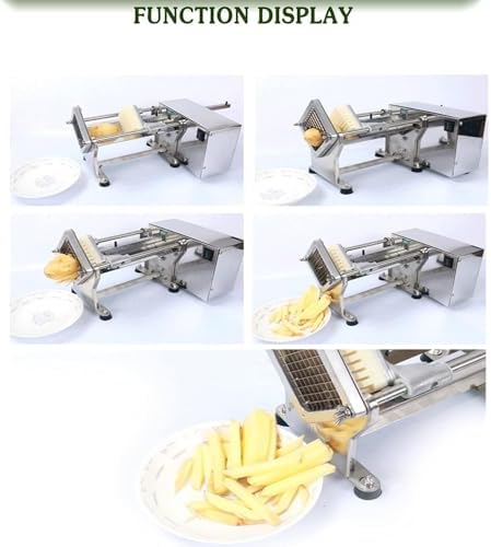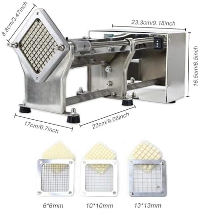 Introducing the Electric Potato Cutter, the essential kitchen tool designed to make food preparation quick and hassle-free. This versatile French fry slicer, crafted from high-quality stainless steel, combines durability with an elegant design that suits both home chefs and commercial kitchens alike. **Specifications:** - Power: 60W - Voltage: 110V/60Hz, 220V/50Hz **Key Features:** 1. Sleek design that enhances any kitchen aesthetic. 2. Robust stainless steel construction for dependable, long-term use. 3. Easy-to-maintain detachable knife head with a premium nut for seamless blade changes. **Versatility:** Equipped with three interchangeable blade sizes (7mm, 9mm, and 13mm), this electric cutter allows you to customize thickness for various dishes, from perfectly crispy fries to finely sliced vegetables. **Functionality:** Effortlessly slice a wide range of vegetables including potatoes, carrots, taro, pumpkin, winter melon, and cucumber. This appliance streamlines your cooking process, making it easier to prepare snacks for family gatherings or healthy meals for everyday dining. The Electric Potato Cutter not only saves you time but also elevates your cooking experience by providing precision and consistency in every slice. Transform your culinary adventures with this indispensable kitchen tool. Experience the joy of cooking with ease and efficiency, knowing that you have the right equipment to enhance your meal preparation. Embrace the convenience and style that the Electric Potato Cutter brings to your kitchen.