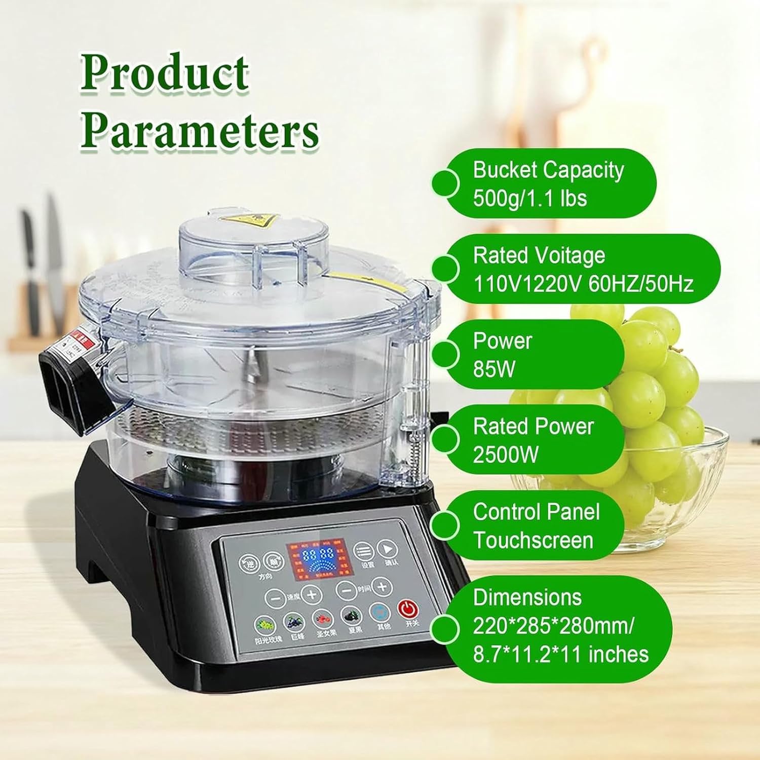 Upgrade your fruit peeling process today with the automatic fruit peeler and enjoy faster, cleaner, and more efficient peeling every time. Whether you're peeling for a commercial grape peeling use or simply need a quick, easy way to prepare fruits at home, this fruit skin peeler is your perfect solution.➤Main Features:1. Transparent cylindrical body for visualizing the peeling process;2. LCD touchscreen use with customizable and preset modes;3. 2500W motor, peels 500g of fruit in 20 seconds;4. Stainless steel blades for precise peeling with minimal waste;5. Food-grade material, durable, quiet, and waterproof;6. Suitable for a variety of small fruits, including grapes, cherries, and blueberries;7. Easy to disassemble and clean, meeting hygiene standards;8. Suitable for both commercial and home use, saving labor and increasing efficiency.➤Product Specifications:- Product Name: Smart Grape Peeler- Power: 85W- Dimensions: 220 x 285 x 280 mm- Bucket Capacity: 500g- Packaging Dimensions: 320 x 340 x 310 mm- Rated Voltage: 110V/220V- Control Panel: Touchscreen- Net Weight: 3.5kg- Color: Black- Applicable Fruits: Grapes, tomatoes, and other small round and oval fruits➤Package Includes:- Smart Grape Peeler x 1➤24H Customer Service:If you have any questions after receiving the package, please contact us as soon as possible, we will always give you a satisfactory answer.