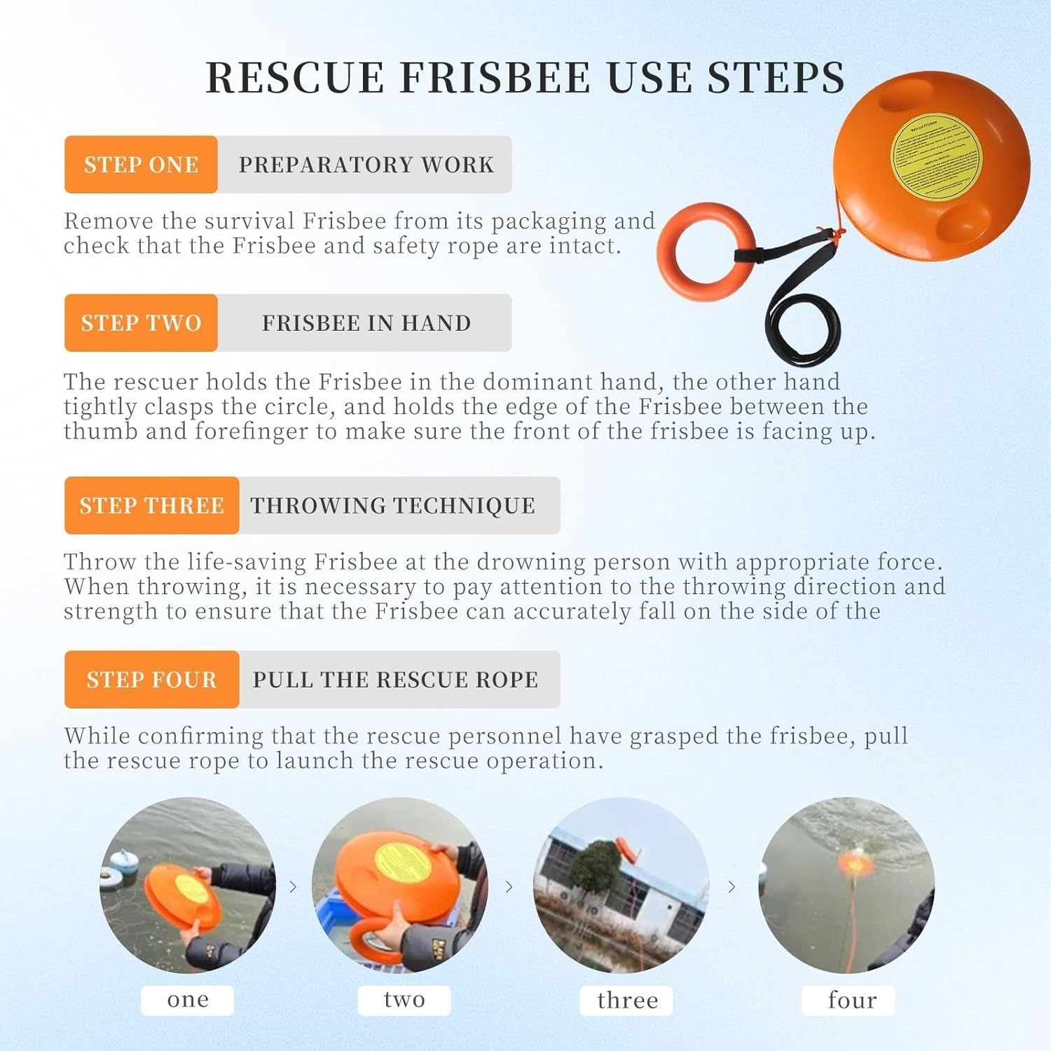 When crashing waves gulp cries for help in an instant, and the water churns with the struggle of those in peril, a single moment of delay can spell disaster.Traditional save gear often fails to reach targets swiftly and precisely. Our professional water save flying disc overcomes these obstacles, setting save efforts into motion and hitting the "fast-forward" for saving lives.Features:1. Crafted from ABS engineering plastic, it boasts impact resistance and long-lasting durability.2. Comes with a 131-foot rope, enabling it to steadily support the weight of a fallen person, whether in fast-flowing rivers or vast seas.3. Features a striking orange hue that stands out sharply in sun, rain, or fog, ensuring the save target is quickly spotted and clearly visible.4. Designed with symmetrical edge grooves, allowing for easy grip by both right and left hands.5. When not in use, the wristband can be tucked into the back of the flying disc, facilitating convenient storage and transport.6. Ideal for scenarios such as water work, bathing areas, and marine navigation, making it an indispensable piece of equipment for lifeguards, water workers, and outdoor sports enthusiasts.Specifications:Name: Water Save Flying DiscShell material: PC + ABS engineering plasticRope material: high strength polypropylene and silkColor: OrangeFlying Disc Diameter: 32cm/12.59inRope Length: 40m/131ftRope Tension: 600NMaximum flight distance: 80m/262ftPackage size: 44x32x15cm/17.32x12.59x5.9inPackage weight: 2.9kg/6.39IbsPackage Included:1 x Water Save Flying DiscNote:1. Due to the difference in light and screen configurations, the color of this item may be slightly different from the pictures.2. Please allow slight size differences due to different manual measurements.3. If you have any questions or suggestions about our products, please send us an email for feedback, we will reply you within 24 hours, and you will get friendly after-sales service.