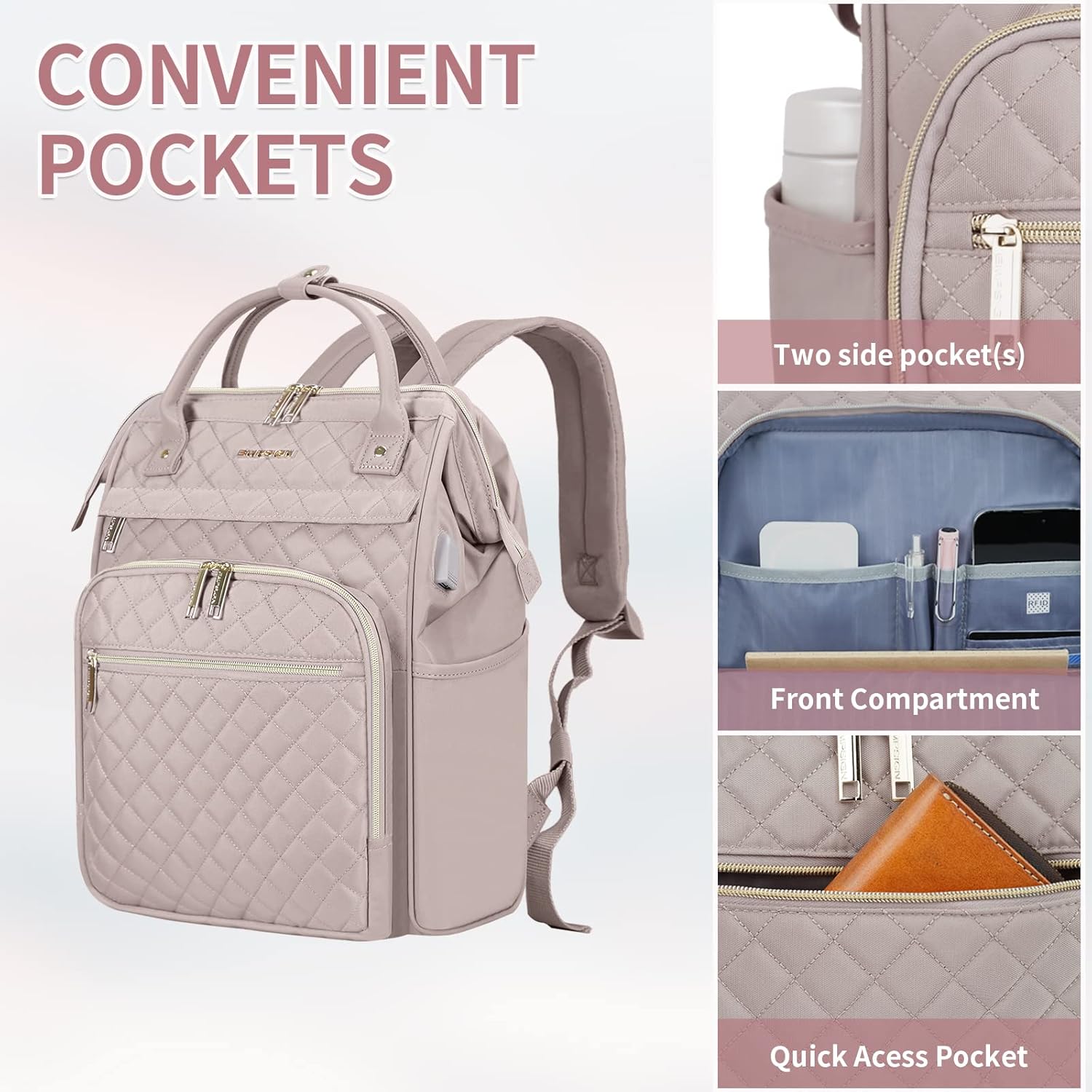 EXPANDABLE AND LARGE CAPACITY: Empsign Women's laptop backpack has a unique expandable feature that gives you additional packing capacity. The backpack features a spacious main compartment, as well as a dedicated laptop compartment. The main compartment is perfect for storing keys, clothes, cameras, umbrellas, etc., perfect for travel enthusiasts. This versatile backpack meets the airline's personal item requirements, facilitates airport security and is conveniently placed under the seat. DURABLE AND USB DESIGN: The laptop backpack is made of waterproof polyester and scratch-resistant materials, while the backpack has good air permeability and heat dissipation, making the backpack more comfortable. Sturdy zipper and sturdy stitching that can withstand the demands of travel. Backpack peripheral USB interface, easy to charge anytime and anywhere, comes with USB charging cable. (Excluding mobile power supply) MULTIFUNCTIONAL COMPARTMENT: Accordion storage design divides the briefcase into 3 main compartments, providing separate space for your 15.6" laptop and all your belongings. The built-in padded laptop section and tablet section protect your device from scratches. The overnight section helps organize clothing and household items. The front stationery section organizes your documents and other small items. The zippered pockets on both sides can hold your umbrella, water bottle, etc. RFID POCKET: Inserting an electronic card into the RFID blocking pocket can stop theft and electronic pickpocketing and keep your information safe inside your briefcase. MULTI-PURPOSE: EMPSIGN rolling briefcase is suitable for overnight stays, commuting, business trips, impromptu trips and road trips. It can be a great gift for family, friends, partners and spouses if he or she is looking for a practical, high quality, professional rolling work bag.