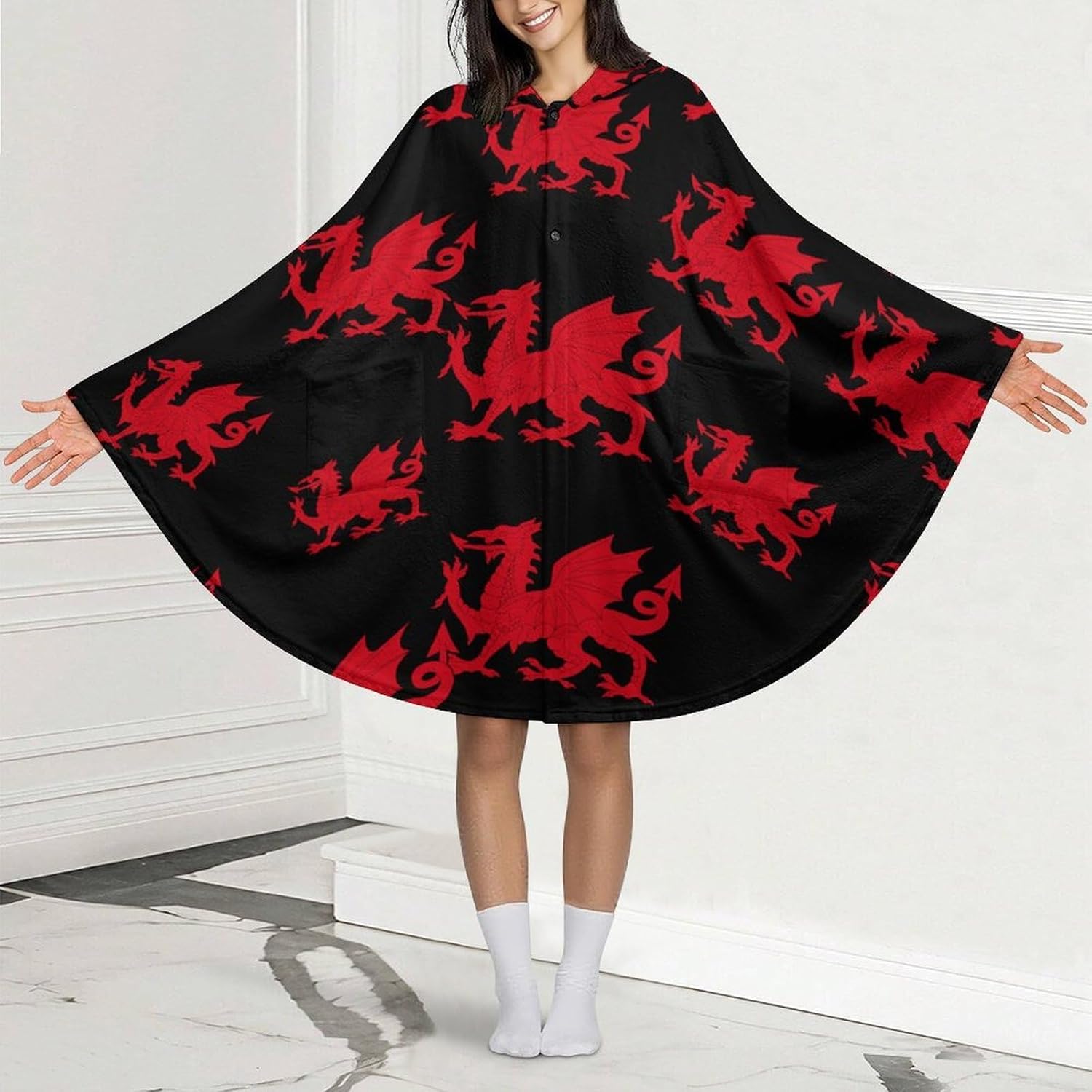 The wearable blanket is made of soft and comfortable flannel fabric, which makes you feel warm in spring, autumn and winter. It has a cape-like shape, a button closure for easy wearing and taking off, and two pockets.