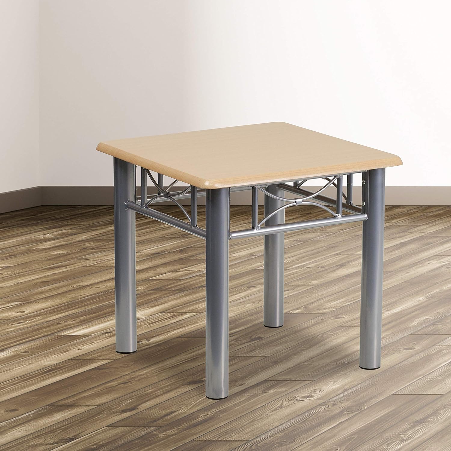Dress up your space and make your office or reception area more inviting with this Natural Laminate End Table. Not only does the ample surface area serve as a convenient space for holding customers' belongings, it's also great for displaying magazines, newspapers, and brochures. Add a lamp and some greenery to create a warm, professional look that is sure to impress your guests. This end table's silver metal frame with decorative sides provides a sturdy foundation while adding a sophisticated touch to any room. The legs are capped with plastic glides, helping to keep your floor surfaces in pristine condition. Create a chic, comfortable sitting area in your lobby with this end table.