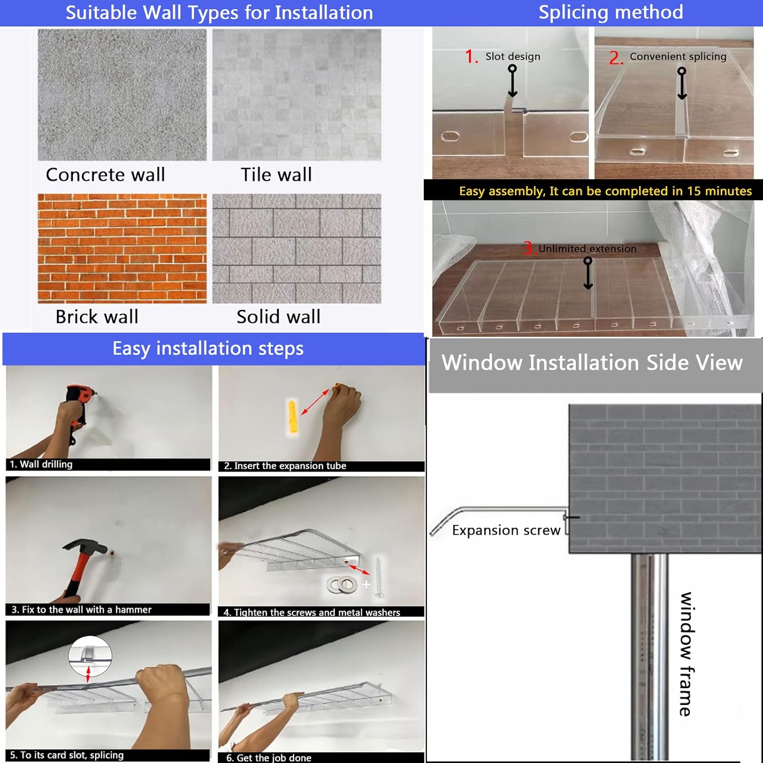 Our awnings won't let you down! You can install it at your front door, back door, balcony, office window, porch, entrance, patio, garden, garage, bar, restaurant, swimming pool, etc. Used to protect from rain, wind, and sun, and to prevent accidental impacts and falling objects from high altitudes. And it’s so clear that you can enjoy an unobstructed view of the outdoors while letting in a steady stream of pure light. There is a layer of UV coating on the surface of the ceiling, which can block 99% of ultraviolet and infrared rays, truly protecting your outdoor appliances, air conditioner units and cars, and slowing down the aging process. The roof will not turn yellow even after many years. Curved arch design effectively reduces rain and snow accumulation. No maintenance required, bringing convenience to people! The bracket is bright in color, smooth and tidy, waterproof and not easy to rust. The maximum load of a single bracket is 150 kg/331 lbs. Great value for money, lightweight and half the weight of glass. The structure is simple and easy to install, making it very suitable for home use. **product information: Name: Outdoor door and window awning Style: modern and simple Dimensions: width x length (can be customized) Color: transparent panel + white bracket Panel material: polycarbonate Panel thickness: 2.5mm/0.1in Maximum load on top plate: 200kg/441lbs Bracket material: aluminum alloy Applicable fixed wall types: wooden walls, cement walls, iron walls, ceramic tile walls, marble walls, solid walls *Scope of supply: 1x Awning (panel quantity 1, 2, 3, 4, 5, 6) 1x complete installation accessories (brackets, front aluminum strips, rear aluminum strips, sealing strips, expansion bolts, screws) **If you have any questions, please send an email to contact us, we are experienced and will solve your pr