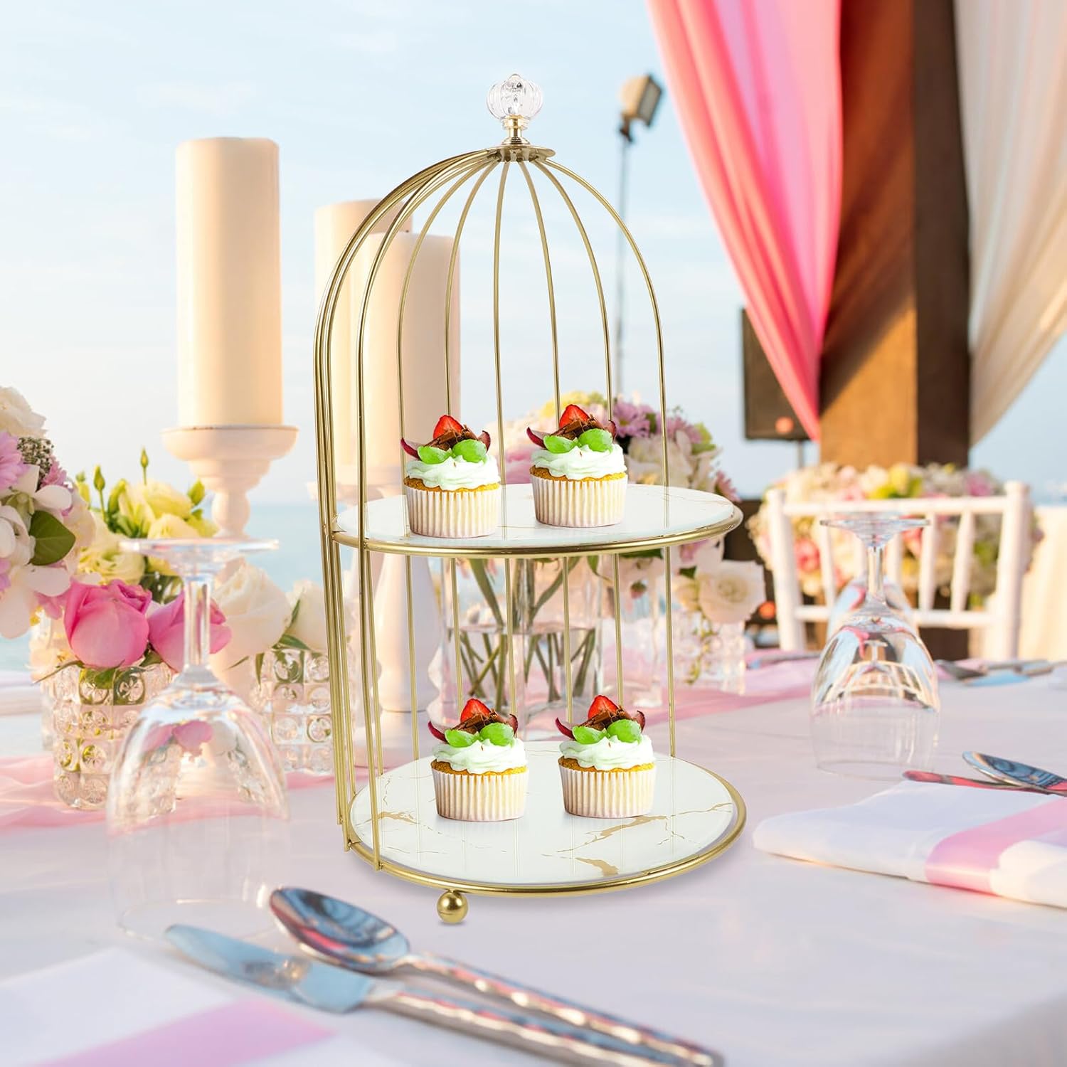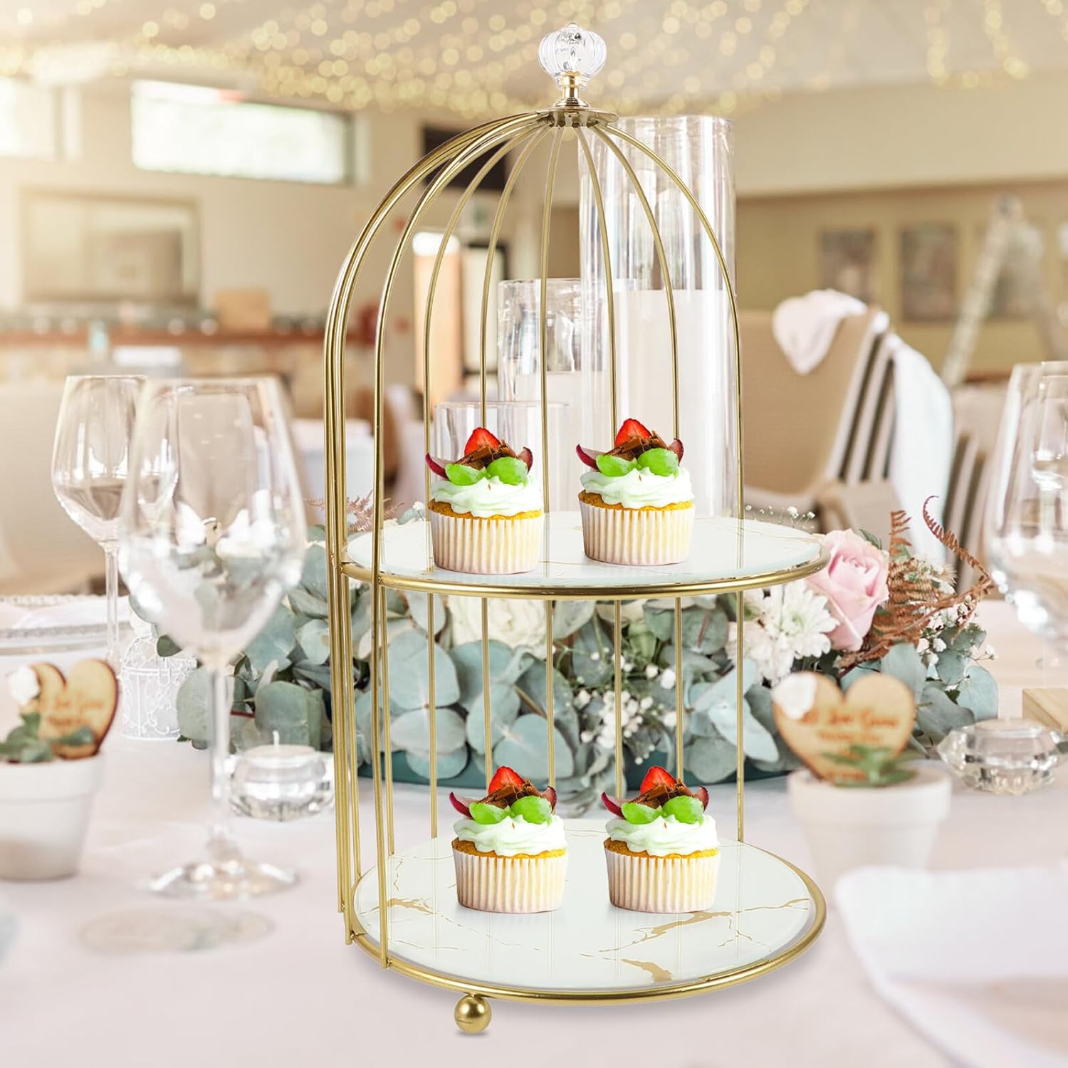 Package Include 1 x Birdcage Cake Stand Characteristics - Color: Multi -Product Info:Bird cage cake stand - Size: 35.00X20.00X20.00cm/13.76X7.86X7.86in -Material:Iron -Featuring a luxurious gold finish and intricate white birdcage details, this stand offers a refined and sophisticated appearance that will impress your guests birds cage cake stand. -Made from metal, this cake stand is designed to be strong and durable, ensuring it can support your desserts with ease and stability dessert stand. -The contemporary and elegant design of this stand enhances the visual appeal of your cakes and desserts, making them the centerpiece of any occasion cake stands wedding reception. -Designed for convenience, this cake stand is quick and easy to assemble and disassemble, making it ideal for portability and storage when not in use vanity trays for bathroom. -This versatile cake stand is for showcasing both desktop and wedding cakes, adding a touch of charm and elegance to any event or celebration dessert cake plate.Goods Informationcreative bird storage rack Our Desktop Cake and Dessert Stand combines functionality with style.bird cage cake stand Made from metal, this stand is built to last.necklace earring organizer The gold finish and white birdcage design make it a beautiful addition to any table setting.perfume storage shelf tray Its simple assembly and disassembly make it easy to transport and store, adding to its convenience