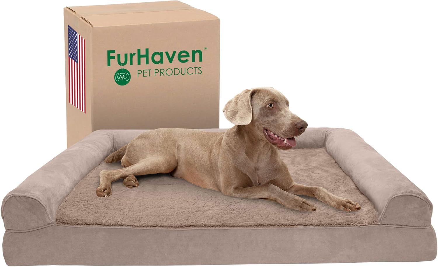 Perfect for pets young and old, the Furhaven Faux Fur & Velvet Sofa-Style Dog Bed is designed to provide your loved one with maximum comfort for a good night’s rest. With a soft, faux fur sleeping surface your pet will be more snug than a bug in a rug! The medical-grade foam core includes a layered orthopedic foam core topped with gel-infused memory foam. Micro gel beads help keep the bed cooler while memory foam conforms to your pet's shape providing superior support of joints and pressure points. Gel foam has cooling properties reducing the sleeping surface by 1 or 2 degrees, wicking heat away from your pet. The superior support provided by both foam cores will help your pet reach a deeper, more restorative rest for your pet's health. These are the perfect dog beds for hot summer days. They’ll love the velvet bolsters' soft but supportive feel provided on three sides giving them a variety of cozy positions to snuggle into. The bolsters are a great pillow for your pet to lie their head on or, for pets that like to cozy into your couch, they can snuggle close to the sides for a sense of security and warmth. Whatever position your pooch likes to lay in, they’ll find nothing but comfort and sweet dreams! With the feel of a couch, your pet will love having their own space to curl into while you’ll love having your favorite spot on the couch back! No more unwanted pet fur and scratches on your furniture. It’s great for older pets who may be unable to jump on the couch and have had to lie on the floor. Easy to clean. Cover care: Remove from core before washing (see seam label for fabric care instructions). Foam care: Cooling gel foam is highly absorbent. Spot clean with mild soap or enzyme-based cleaning spray. Rinse but DO NOT SOAK OR SUBMERGE. Press out moisture with a dry towel and air dry. A fan may be used to speed drying. Do not wring or place in machine dryer. Dry completely before use. Not for unsupervised use by animals with destructive chewing behavior.