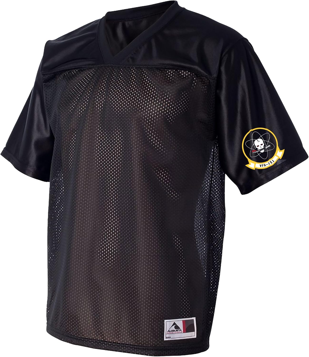 Celebrate your love for aviation and the legendary VFA-151 Vigilantes squadron with the VFA-151 Vigilantes Squadron Logo Replica Football Jersey. Made of 100% polyester tricot mesh and dazzle fabric, this high-quality jersey features a V-neck collar and set-in sleeves for ultimate comfort. Perfect for fanwear, this jersey is a must-have for any aviation enthusiast. Get yours today and showcase your squadron allegiance in style!