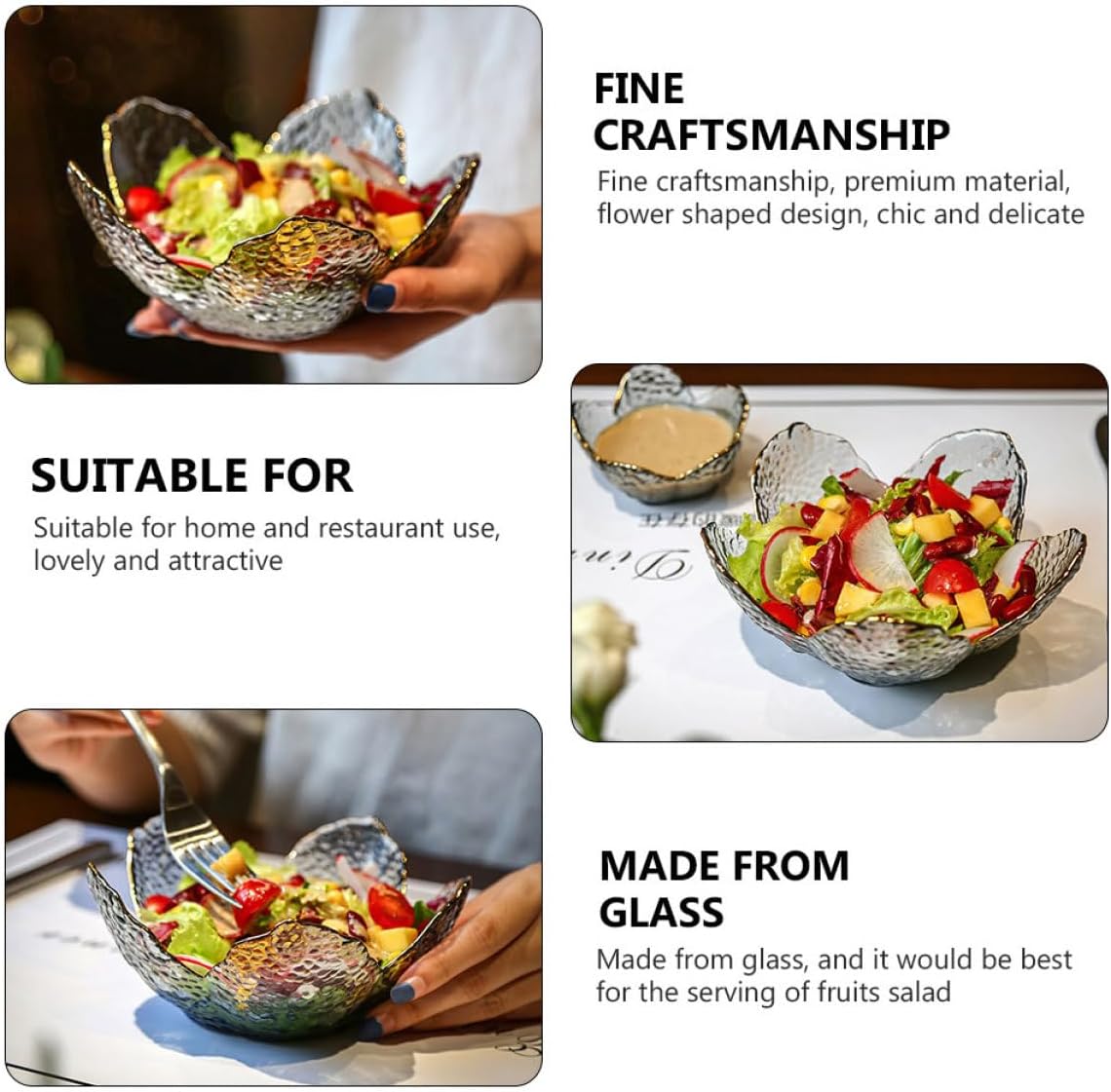 Package List 3 x plates Characteristics - Size S: 9.00X9.00X4.50cm/3.54X3.54X1.77in. -Product Info:Gold-edged glass bowl - Size L: 16.00X16.00X8.00cm/6.29X6.29X3.14in. - Color: Grey. - Size : 12.00X12.00X4.50cm/4.72X4.72X1.77in. - Material: glass. - It can be used for salads, fruits, oatmeal, etc., and can also be used for decoration and posing Snack Serving Bowl. - Fine craftsmanship, , flower shaped design, chic and delicate. - This is a bowl made from glass, and it would be best for the serving of fruits salad Glass Bowl. - Suitable for home and restaurant use, lovely and attractive Breakfast Bowl. - A home essential tool, easy to clean. Transparent appearance is easy to observe the food it holds Glass Tableware.Goods DescriptionSnack Serving Bowl With the fine craftsmanship, along with the , this product that we are making would be very to use.Fruit Bowl This is a bowl made from glass and with its size it would be best for the serving of salad, fruits, noddles and so on