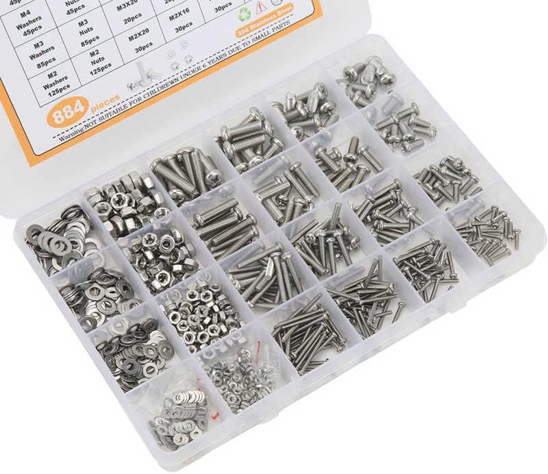 884Pcs Pan Screw Nut Washer Assortment Kit with Hex Wrench M2 M3 M4 M5 304 Stainless Steel Screw Set Features: 1. Kit Contents: This kit contains various screws, nuts and spacers for M2, M3, M4 and M5, and comes with a hex wrench and storage box.2. No Deformation: Tight and uniform threads are less likely to deform and slide during rolling and installation, allowing you to work more smoothly and improve efficiency.3. Clear Threads: Accurate design provides maximum tightness. Standard production, slick appearance, clear threads, uniform and burr free, easy to install.4. 304 Stainless Steel: Our sets are made of nice 304 stainless steel, with fine workmanship, high strength and great corrosion resistance in harsh environments such as high temperature, cold and high humidity.5. Easy to Carry: As mentioned before, the storage box included in the set keeps all the screws, nuts and washers neatly organized, so it is easy to carry around and great to put into use. Specifications: Item Type: Screw Nut Washer Assortment KitMaterial: 304 stainless steelColor: SilverUse: Widely used in various accuracy machinery, sorting instruments, meters, electronic products, household appliances, communication products, locks, lamps, lanterns, toys, etc. Package List: 125 x M2 Washers 125 x M2 Nuts 30 x M2x20mm Screws 30 x M2x16mm Screws 30 x M2x12mm Screws 30 x M2x8mm Screws 85 x M3 Washers 85 x M3 Nuts 20 x M3x20mm Screws 20 x M3x16mm Screws 20 x M3x12mm Screws 20 x M3x8mm Screws 45 x M4 Washers 45 x M4x Nuts 10 x M4x20mm Screws 10 x M4x16mm Screws 10 x M4x12mm Screws 10 x M4x8mm Screws 45 x M5 Washers 45 x M5 Nuts 10 x M5x20mm Screws 10 x M5x16mm Screws 10 x M5x12mm Screws 10 x M5x8mm Screws 1 x Storage Box 3.