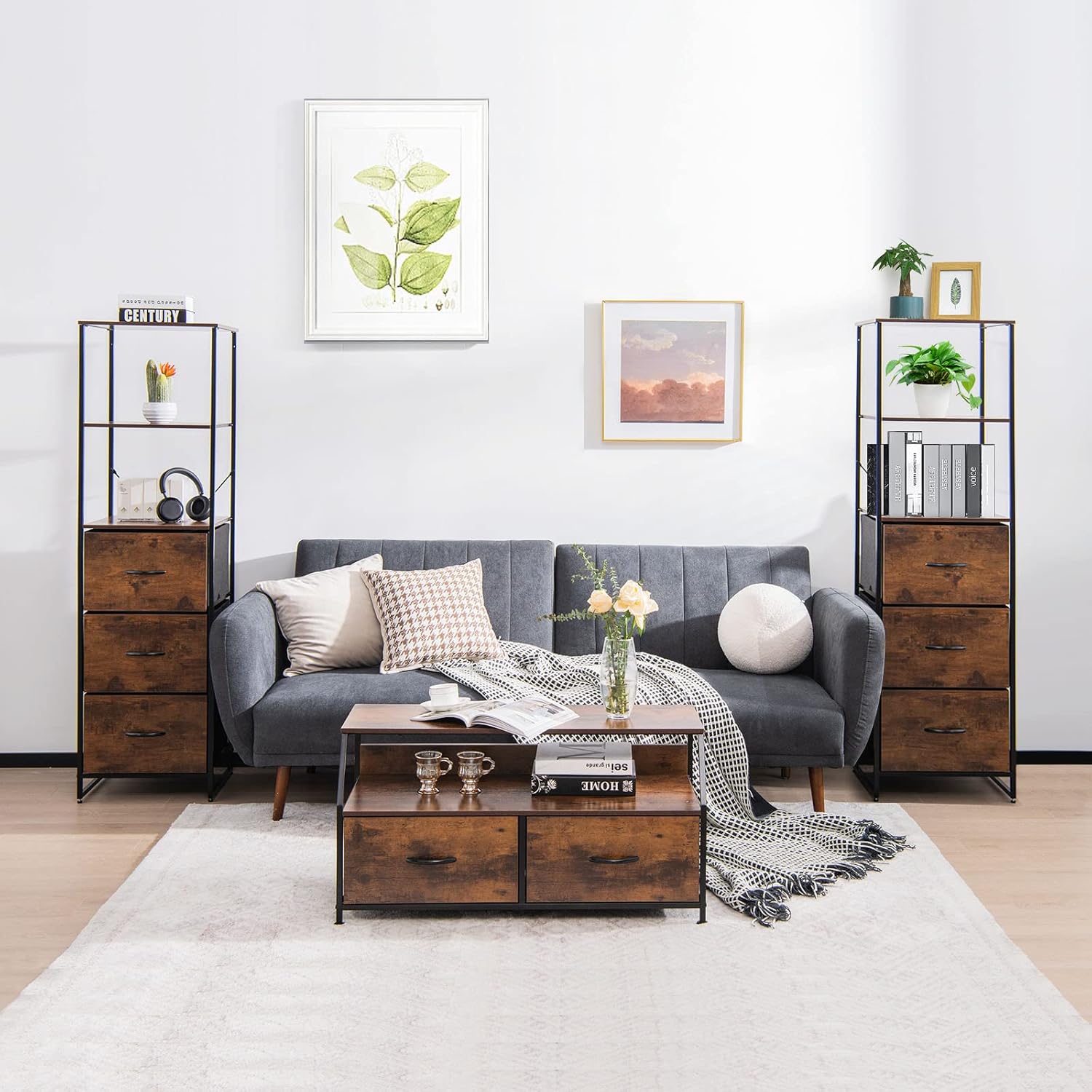 Description:Are you looking for a decorative yet functional piece of furniture for your home or office? Then this bookshelf with storage may well satisfy your needs! The 3 open shelves and 3 fabric drawers provide adequate space for your daily supplies, keeping mess out of sight while displaying your beloved collections or ornaments. What’s more, with an industrial appearance, the drawer organizer unit is ideal for different rooms, such as bedroom, living room or study. By the way, the tall dresser supported by a steel frame is stable and durable, especially with the X cross bars. In addition, the adjustable foot pads and anti-toppling device add to the overall stability.Features:6-tier storage bookshelf is ideal for both display and storage3 fabric drawers provide enclosed space for privacy protectionSupported by a solid steel frame for a large bearing capacitySmooth MDF shelves are waterproof and easy to cleanFitted with non-slip and adjustable foot padsWith anti-toppling device for added safetyLightweight and foldable drawers facilitate assemblyCan be used in bedroom, study, living room, entrywaySpecification:Color: Rustic BrownMaterial: MDF, Non-woven Cloth, SteelOverall Dimensions: 17” x 15” x 61.5” (L x W x H)Net Weight: 25.5 lbsDrawer Dimensions: 15.5” x 15” x 10” (L x W x H)Weight Capacity of Each Shelf: 22 lbsWeight Capacity of Each Drawer: 11 lbsPackage Includes:1 x 6-Tier Dresser1 x InstructionWhy you choose our 6-tier bookshelf?√ The bookshelf can either be used to display ornaments or stores sundries, making the room much tidier.√ The bookshelf is rather stable with reinforce steel construction and safety wall mount design.