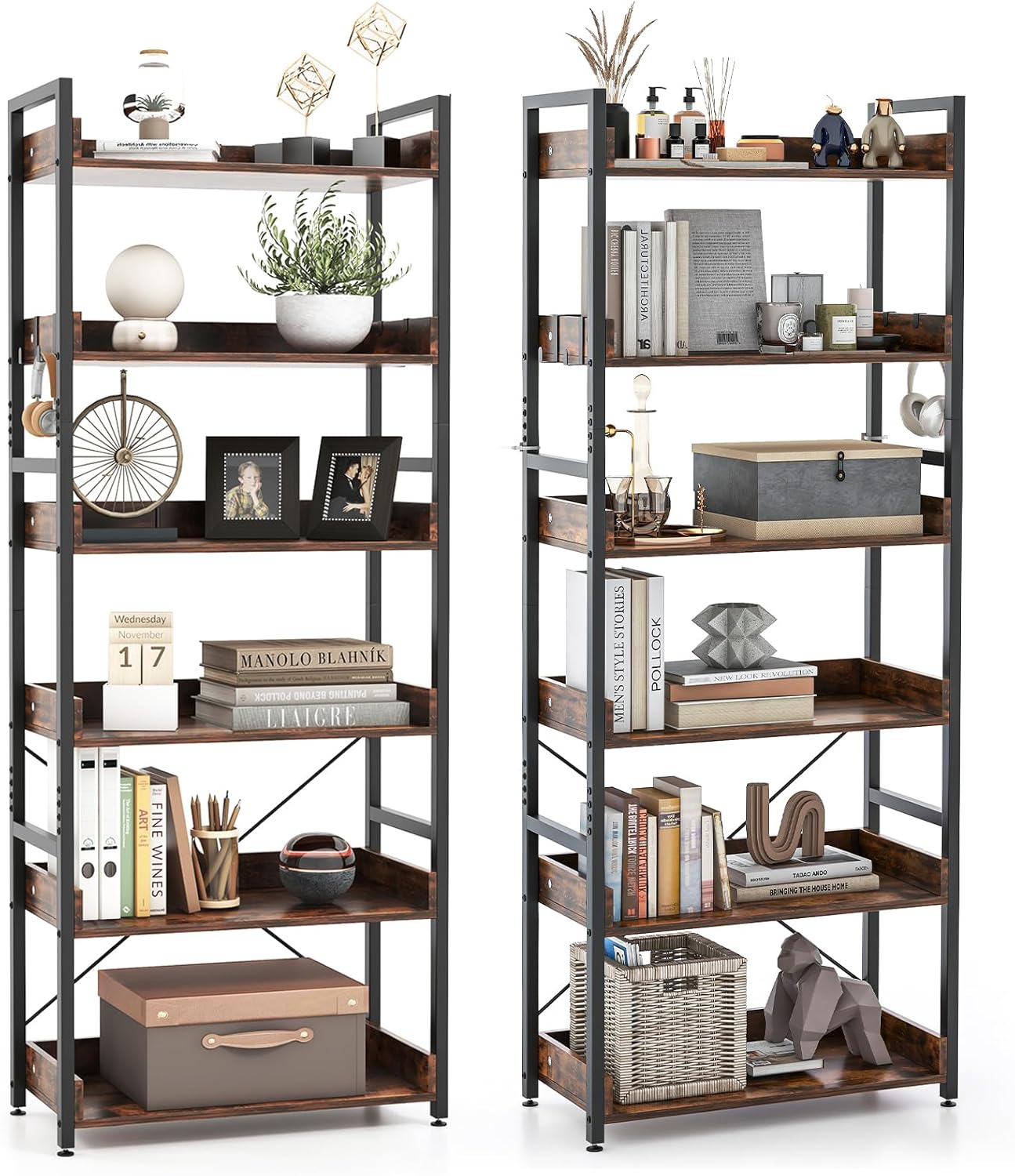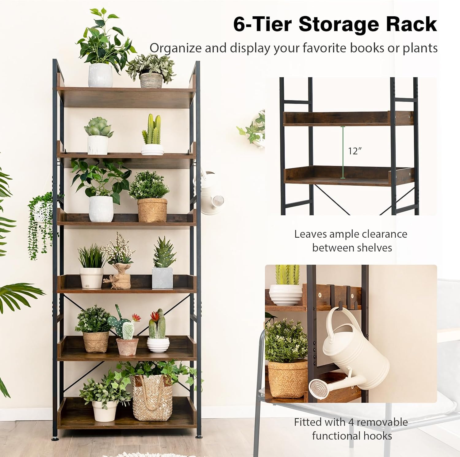 Description: Giantex 6-tier industrial bookshelf combines aesthetics and practicality. The open design of this bookshelf provides an ideal platform for displaying books, family photos, potted plants, utensils and many other items. With 4 removable hooks, you can easily hang hats, headsets, towels, bags etc. Made of thick engineered wood and robust metal tubes, the bookshelf is built to last. In addition, the secure anti-tipping device and adjustable foot pads enhance the overall stability. The vintage industrial style makes it blend perfectly with your living room, bedroom, kitchen, study, office, etc., and you can place a single bookshelf or simply place several bookshelves side by side to form a functional storage wall. Features: 6-tier bookshelf comes with ample open storage space Includes 4 removable hooks for hanging hats, towels, etc. Made of thick engineered wood and sturdy metal frame Can be firmly anchored to the wall with anti-tipping device Adjustable foot pads add stability while protecting the floor Raised edge and X-shaped bracket prevent items from falling Applicable to study, living room, kitchen, bedroom, office Quick and effortless assembly with step-by-step instruction Specifications:Color: Rustic Brown Material: Metal, Engineered Wood Overall Dimension: 27" x 13.5" x 70"(L x W x H) Dimension of Shelf: 24.5" x 13"(L x W) Height Between Shelf: 12" Height of Raised Edge: 2.5" Net Weight: 56 lbs Weight Capacity of Each Shelf: 50 lbs Package Includes: 1 x Bookshelf 4 x Hooks 1 x User Guide
