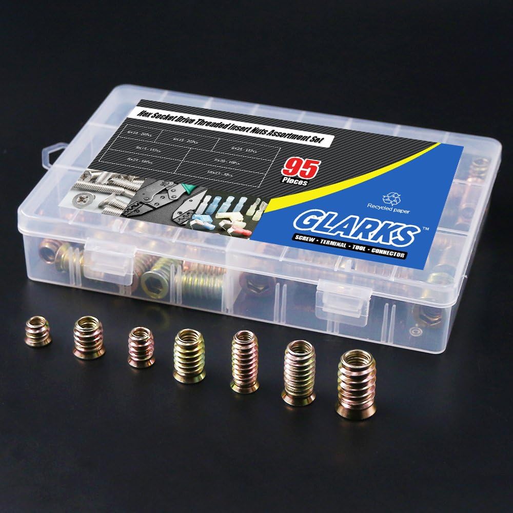 Glarks high precision hex socket flanged threaded insert nuts assortment kit Material: Zinc alloy Size: M6*10, M6*15, M6*25, M8*15, M8*20, M8*25, M10*25 Feature: Easy to install, high stability Application: Suitable for soft woods of pine, plywood, fiberboard, etc, have a good effect in the furniture combination Package details: M6*10 -------------- 20pcs M6*15 -------------- 20pcs M6*25 -------------- 15pcs M8*15 -------------- 15pcs M8*20 -------------- 10pcs M8*25 -------------- 10pcs M10*25 ------------ 5pcs Total: 95pcs NOTE1: Drill a well-sized hole first with tools before installation, when the material is high-hardness, please enlarge the hole NOTE2: Please check the size carefully before purchasing, thanks for your support ! NOTE3: We will do better, if you received damaged box or found product quality problems, please feel free to contact us, we will try to meet your requirements of refund or return
