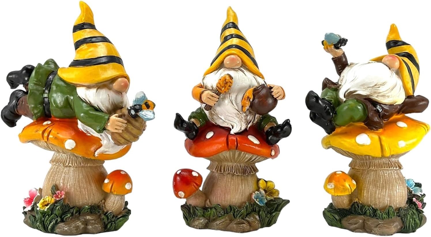 Spring Gnome on Mushroom. Made of Resin. Gnome on Yellow Topped Mushroom: 5.5 Inch Height x 3.5 Inch Length x 2.5 Inch Wide. Gnome on Red Topped Mushroom: 6.5 Inch Height x 3 Inch Length x 2.5 Inch Wide. Gnome on Orange Topped Mushroom: 6 Inch Height x 4 Inch Length x 2.5 Inch Wide.