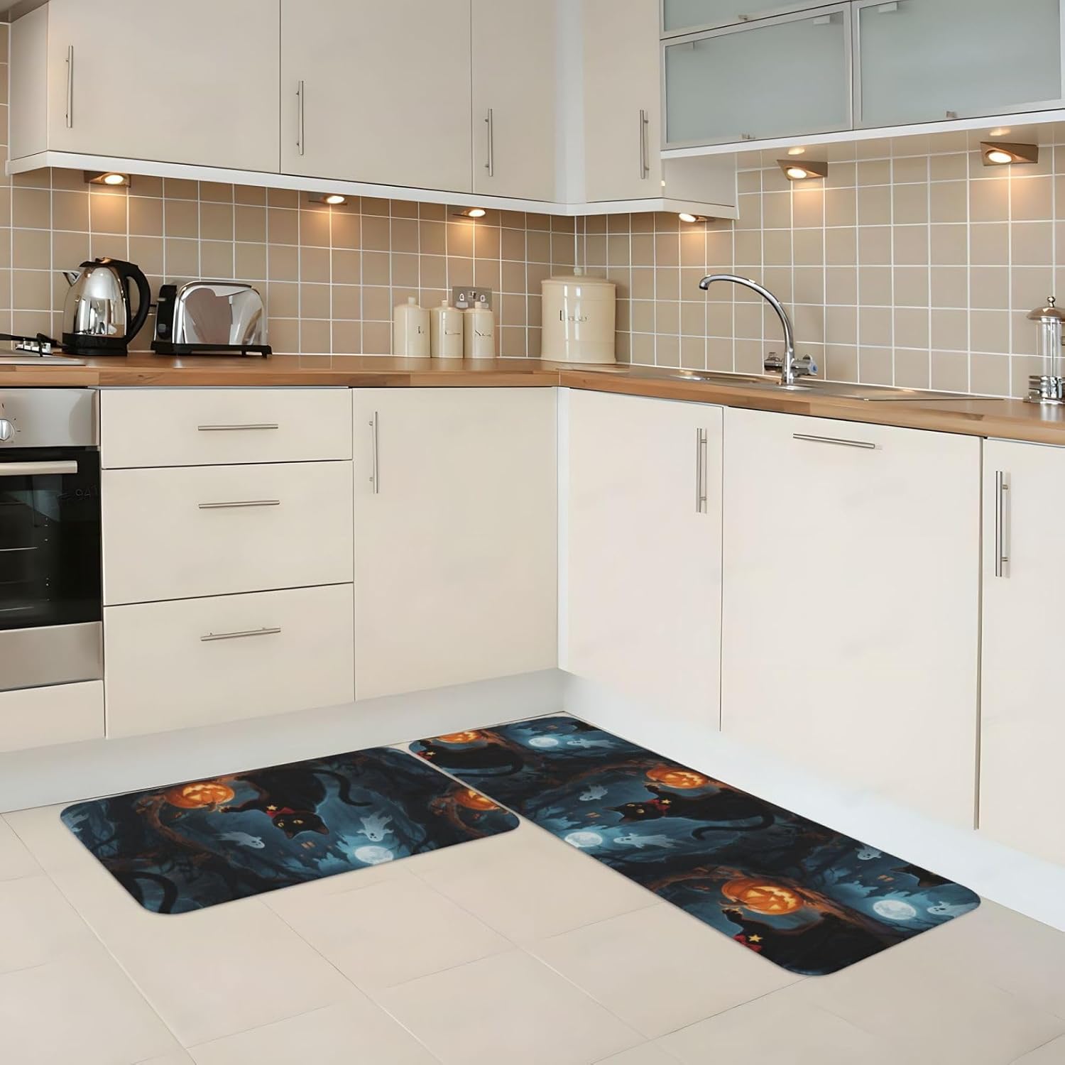 Kitchen Rugs and Mats, Anti Fatigue Comfort Standing Kitchen Runner Mat Halloween Cat Kitchen Floor Mat 2 Sets Boho Kitchen Rug for Kitchen Decor Floor Mat Runner Carpet for Hallways Farmhouse Kitchen Mat, Cushioned Anti Fatigue Kitchen Mats for Floor, Non Slip Rugs for Kitchen Floor, Halloween Cat Kitchen Mat Anti Fatigue Cushioned, Memory Foam Padded Standing Rug Washable, Non Slip Comfort Floor Runner for Home, Sink, Laundry, Office Cushioned Kitchen Mats for FloorSize: The set contains 2 rectangular mats (17.3"*29.5"+17.3"*47.2").Durable and non-slip: It's made of PVC material, the grain backing prevent slipping or shifting.Decent design: The simplicity pattern and color make your kitchen more stylish.Multi-purpose: Suitable for laundry, doorway, outdoor, kitchen, foyer, bathroom, etc.Easy to clean: Waterproof material make this anti fatigue mat easy to clean, just wipe it with wet cloth.Stylist Multi-functional Floral Anti Fatigue Kitchen Mats Set: These 2-piece farmhouse kitchen rug set includes a kitchen runner + rectangle kitchen carpet, fitting most kitchen spaces, also suitable as standing desk mat, laundry room rug and runner,office mat,doormat, bedroom rug ,bathroom rug mat, bedroom accent or other anti fatigue mat application, provides a warm accent for the home or kitchen.Also be great gift idea for Thanksgiving,Christmas or any other holiday!