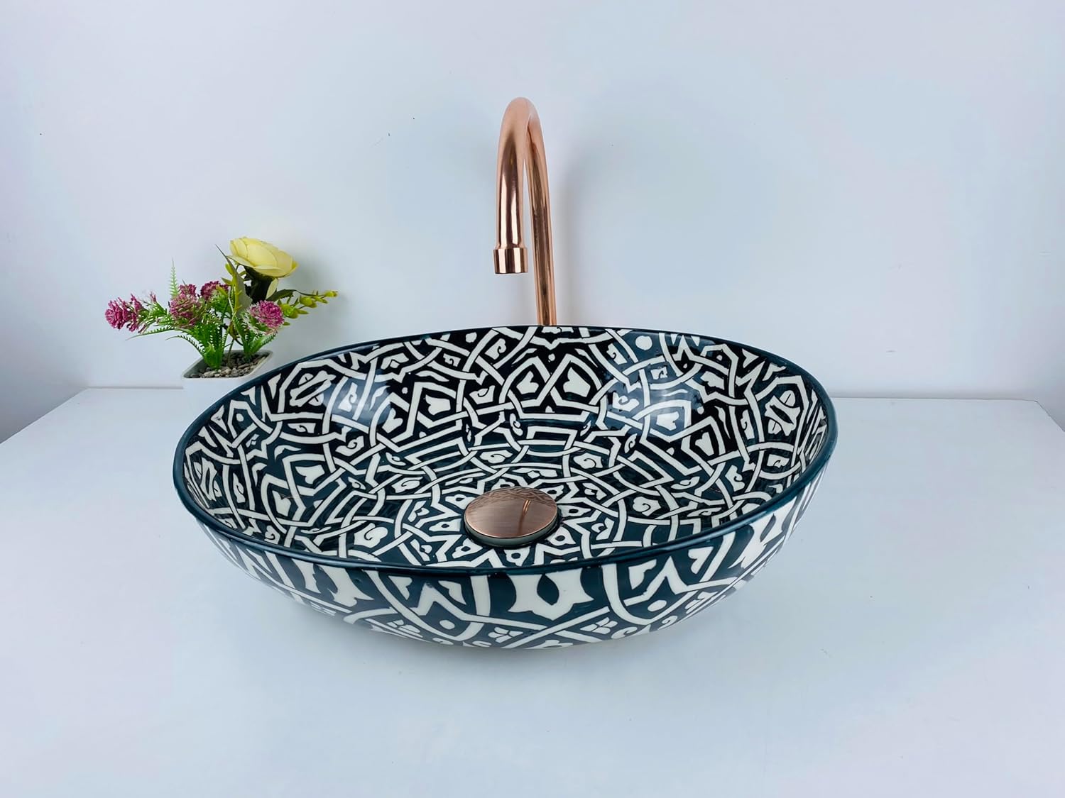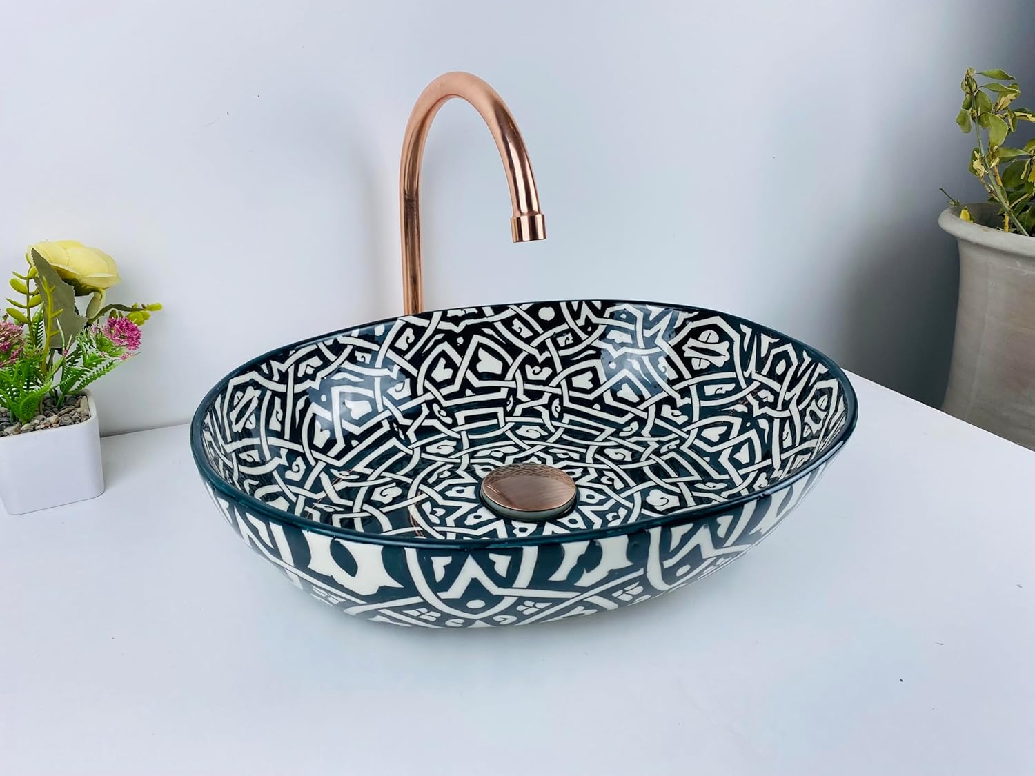 This handmade Moroccan ceramic vessel sink by Brassatelier combines bold geometry with timeless craftsmanship. Each wash basin is carefully shaped, glazed, and hand-painted by artisans in Fez, Morocco, creating a piece that is both functional and artistic. The black and white geometric pattern brings a sophisticated, architectural look to any bathroom. Fired at high temperatures, this ceramic sink offers exceptional durability, water resistance, and easy maintenance for everyday use. Because every piece is handmade, slight variations in pattern and color make each sink truly unique, a statement of authentic artisan craftsmanship.