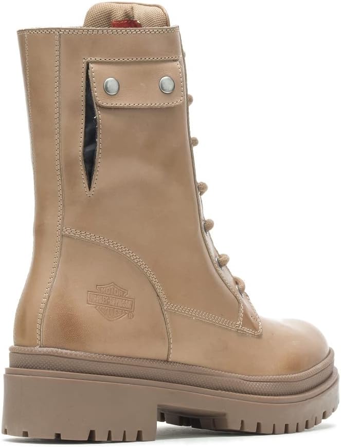 Harley-Davidson Women's Tressler Snap Pocket Riding Appropriate* 8-Inch Black or Tan Motorcycle Boots, Black-D87209, Tan-D87211. With a fashion forward edgy silhouette, the Tressler 8-Inch motorcycle boot, with a functional outside snap pocket, is built for the modern female rider. Featuring breathable waterproof full-grain leather and a Hydro-Guard waterproof membrane, these boots get you there, rain or shine. The outsole is lightweight. This, combined with a modest 1.5" heel makes these boots comfortable and ready for any destination – they are ride and nightlife ready. The toe is rounded and the tongue padded. YKK locking inside zippers aid in the donning process. An outside snap-pocket is an added feature for storage of keys, identification cards, etc. Bar & Shield logos are debossed on the heel’s counter and on the tongue. The boot's sole, insole and upper are bound using cement construction processes, a time honored and durable method that allows for a flexible and easy stride. Total height: 9.5", Shaft height: 8", Heel height: 1.5". Sizes US: M 5-10, 11. Manufacturer Part Number, Black-D87209, Tan-D87211. *Riding Appropriate – Abrasion, slip, and oil-resistant boots, ideal for riding motorcycles.