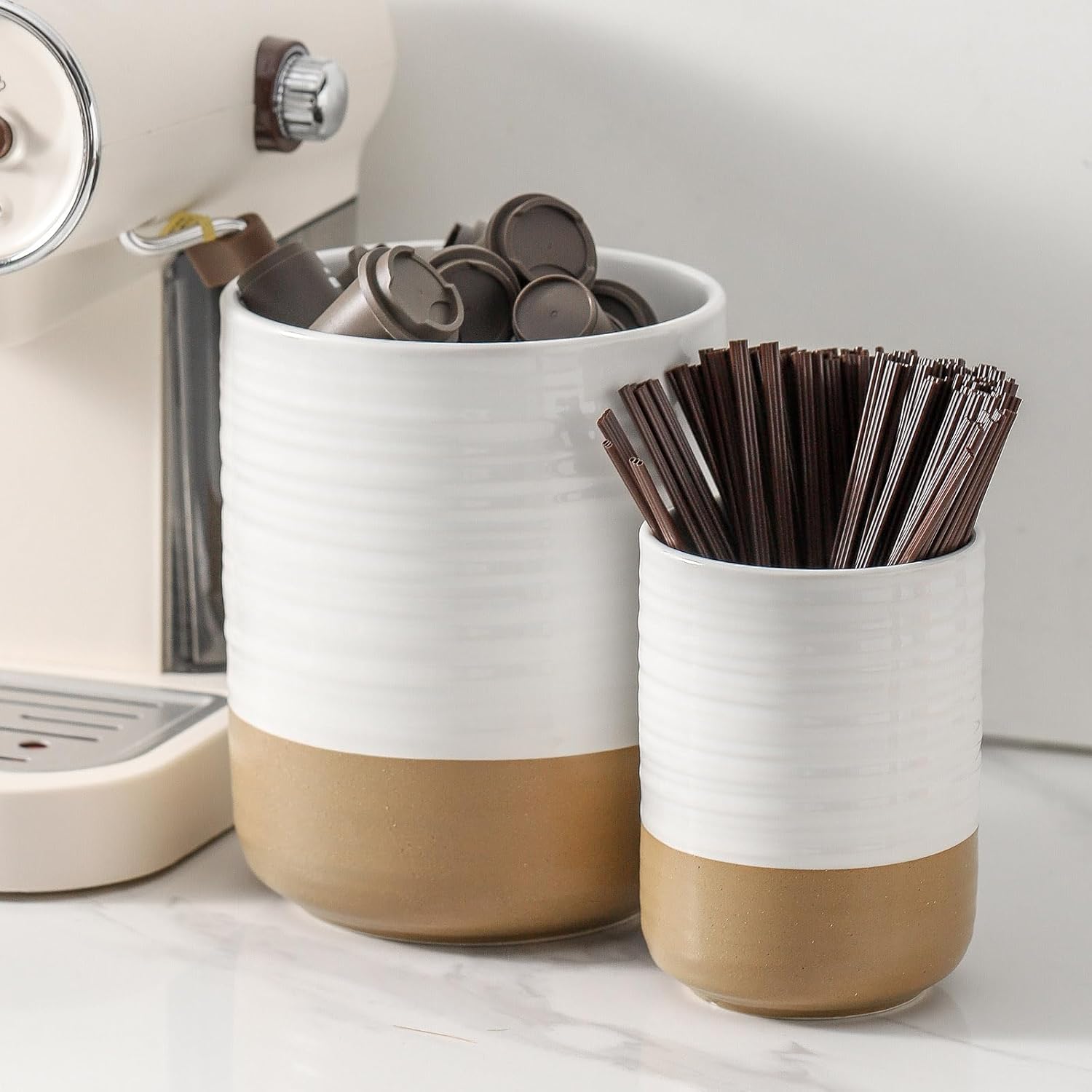 This Hasense Ceramic Butter Dish and Utensil Holder Set combines style and functionality for a perfect kitchen upgrade. The butter dish features a water seal to keep butter fresh and spreadable, while the large utensil holder provides ample space for organizing kitchen tools. Both pieces offer a timeless farmhouse design, ideal for enhancing any countertop or as a thoughtful gift for special occasions.