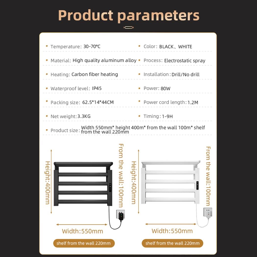 • ★ Fast Heating & Overheat Protection: Heating Power: 80 W. The towel warmer rack is better for warming clothes and keeps a proper and stable temperature between 30-70℃/86-158 °F. With no more than 20 minutes can the rack reaches the peaking temp. of 158 °F, and then automatically stops heating for security use. No worries about the accidental touch because of its non-scalding feature