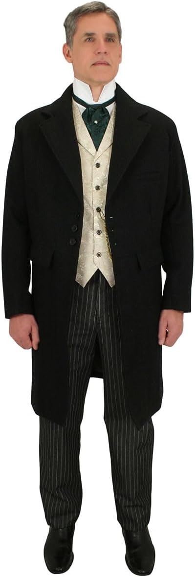 Experience the epitome of Victorian style with our versatile 100% Wool Frock Coat, effortlessly transitioning from daytime errands to evening soirees throughout the 1860s and 1870s.Crafted for both style and practicality, this coat boasts a distinguished notched collar for a refined look and multiple pockets for convenient storage of essentials (three front pockets and 2 inside pockets). As well as the frock coat's defining characteristic, a seamed waist for a flattering silhouette. Its substantial weight offers unparalleled warmth and comfort, ensuring you stay cozy in any setting.Constructed from 100% heavy melton wool and lined in satin. Dry clean only. Imported. Available in sizes 36–52.Sizing NotesOur coats are made with typical American sizing, meaning your chest measurement (in inches) is the size you should choose.To measure your chest: Raise your arms slightly and measure just under your arms. Be sure to cross over the shoulder blades and the fullest part of the chest. If your belly measures larger than your chest, use your belly measurement for coat size.See our storefront for more items to complete your look, including Historical Emporium Dress Shirts, Historical Emporium Neckties, Historical Emporium Vests, and Historical Emporium Trousers!