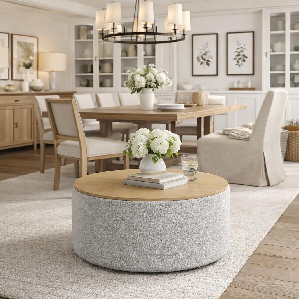 Our Storage Ottoman with Wood Top in a multi--color boucle fabric offers a sleek, modern design with functional storage. Use it in your living room or family room to contain controllers, remotes or toys or place it in your bedroom to store extra pillows or blankets. Two paired together doubles the impact wherever you need it most! Easy to assemble and maintain. Spot clean only.Please note that fabric and wood colors may appear slightly different due to variations in lighting or screen settings.