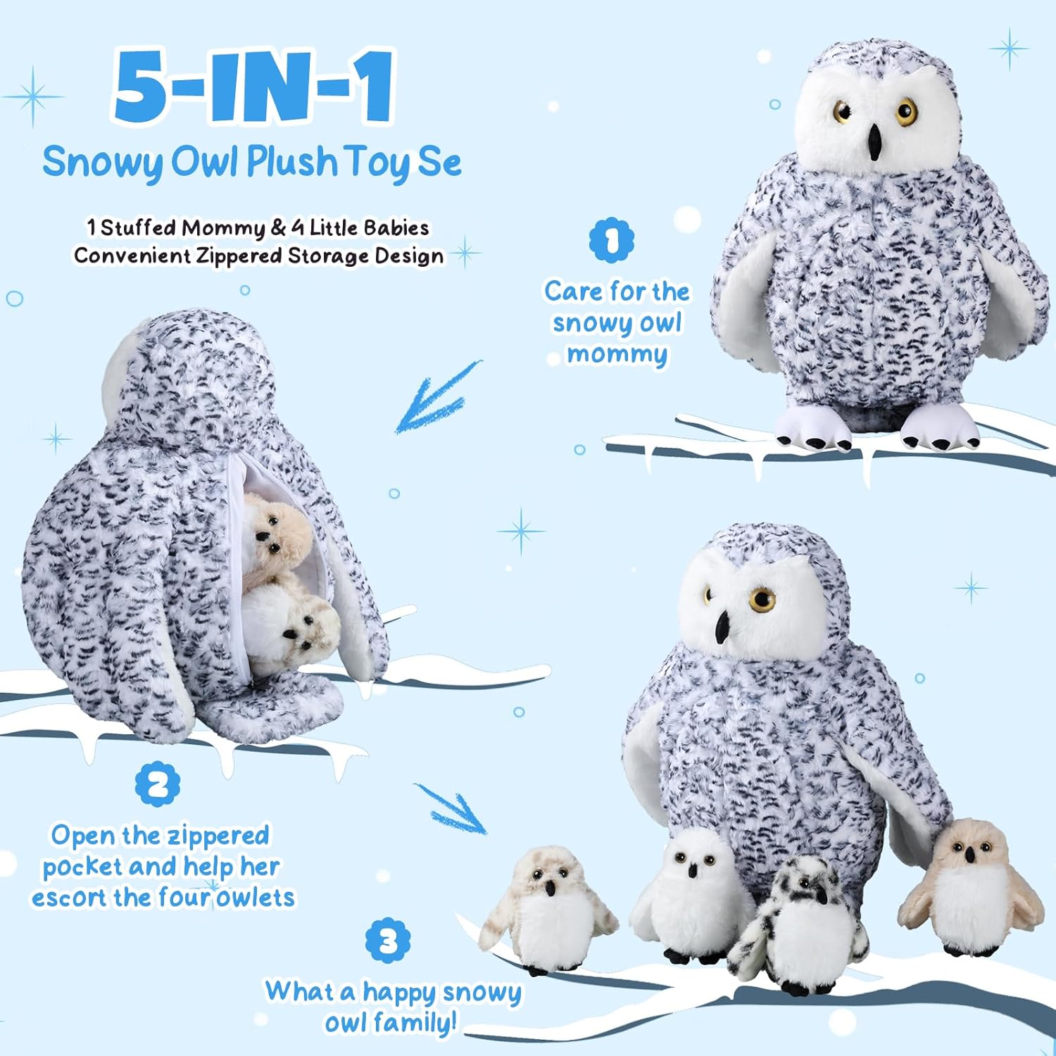 Features: This snowy owl stuffed animal set is a creative plush toy combination that combines play, storage and companionship. The mommy owl features a zippered belly that holds the four baby owls, making it easy for kids to store and carry them wherever they go—at home, in the car, at school, or while traveling. Whether it is used as a daily companion, or for festivals, parties or gifts, this set of stuffed owl plush toys will become a warm friend in children's childhood. Specifications: Material: plush fabric, pp cotton Color: black, white, grey Size: Mommy owl stuffed animal: 14 inch/35 cm Baby owl stuffed animal: 4.7 inch/12 cm Package includes: 5 x Snowy owl stuffed animals Notes: Manual measurement, please allow slight errors on size. The color may exist a slight difference due to different screen displays.