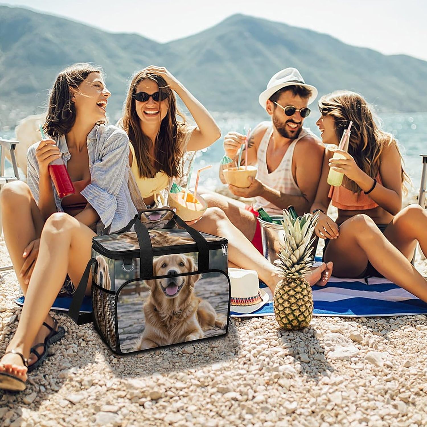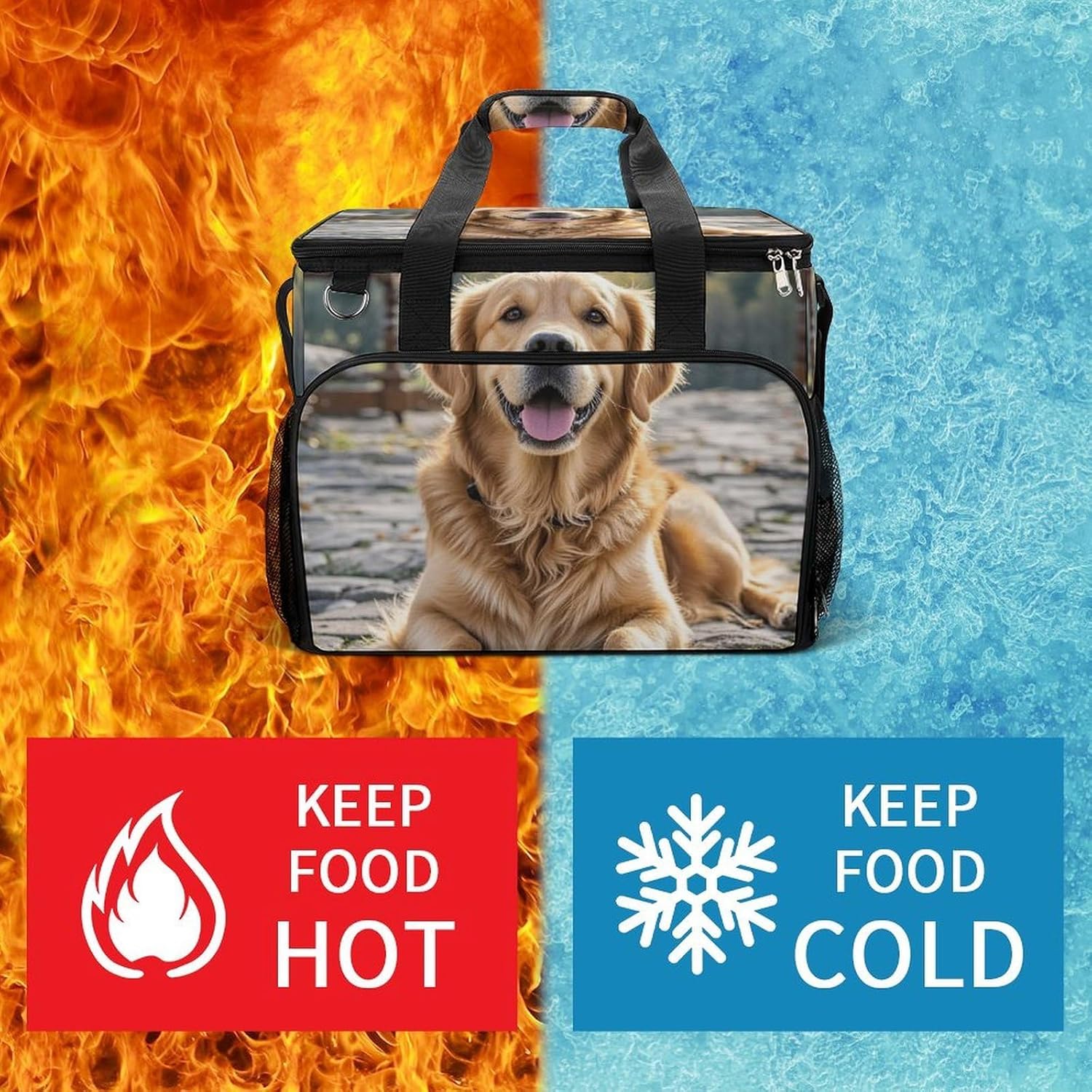 Take Your Meals Anywhere with Golden Retriever Dog Grocery BagsFood Container Carrier Oxford Fabric Picnic Bag Heat Retaining Food Bag Camping Cooler BBQ Accessories Cute Picnic Bag with Pockets Insulated Food Bag for Work Insulated Lunch Tote Bag Camping BagTemperature Control That WorksThe upgraded aluminum foil lining creates an effective thermal barrier. Your drinks stay refreshingly cold, and your hot dishes maintain their warmth for hours. No more lukewarm meals during outdoor outings.Thoughtful Storage DesignTwo side mesh pockets - Perfect for water bottles or umbrellasFront zippered pocket - Keeps keys, phone, or condiments organizedInternal mesh pocket - Stores utensils, napkins, and small essentialsMain compartment - Spacious enough for food containers and snacksBuilt for Daily AdventuresConstructed from high-density oxford fabric with reinforced stitching at stress points. The double zippers are sturdy and smooth-operating. Reinforced handles let you carry heavy loads with confidence.Carry Your WayHandles for quick grabbingStands upright for easy packing and accessPerfect For:Picnics in the parkBeach days and pool partiesCamping and hiking tripsOutdoor concerts and festivalsDaily work lunchesGym and fitness classesRoad trips and travelGrocery shoppingSpecifications:Dimensions: 15.4 x 11.8 x 11.8 inchesMaterial: High-density Oxford fabricLining: Aluminum foil (insulated)Closure: Sturdy double zippersPockets: 2 side mesh, 1 front zipper, 1 internal meshCare: Hand wash or machine wash, do not bleachNote: Food containers and utensils shown in images are not included.
