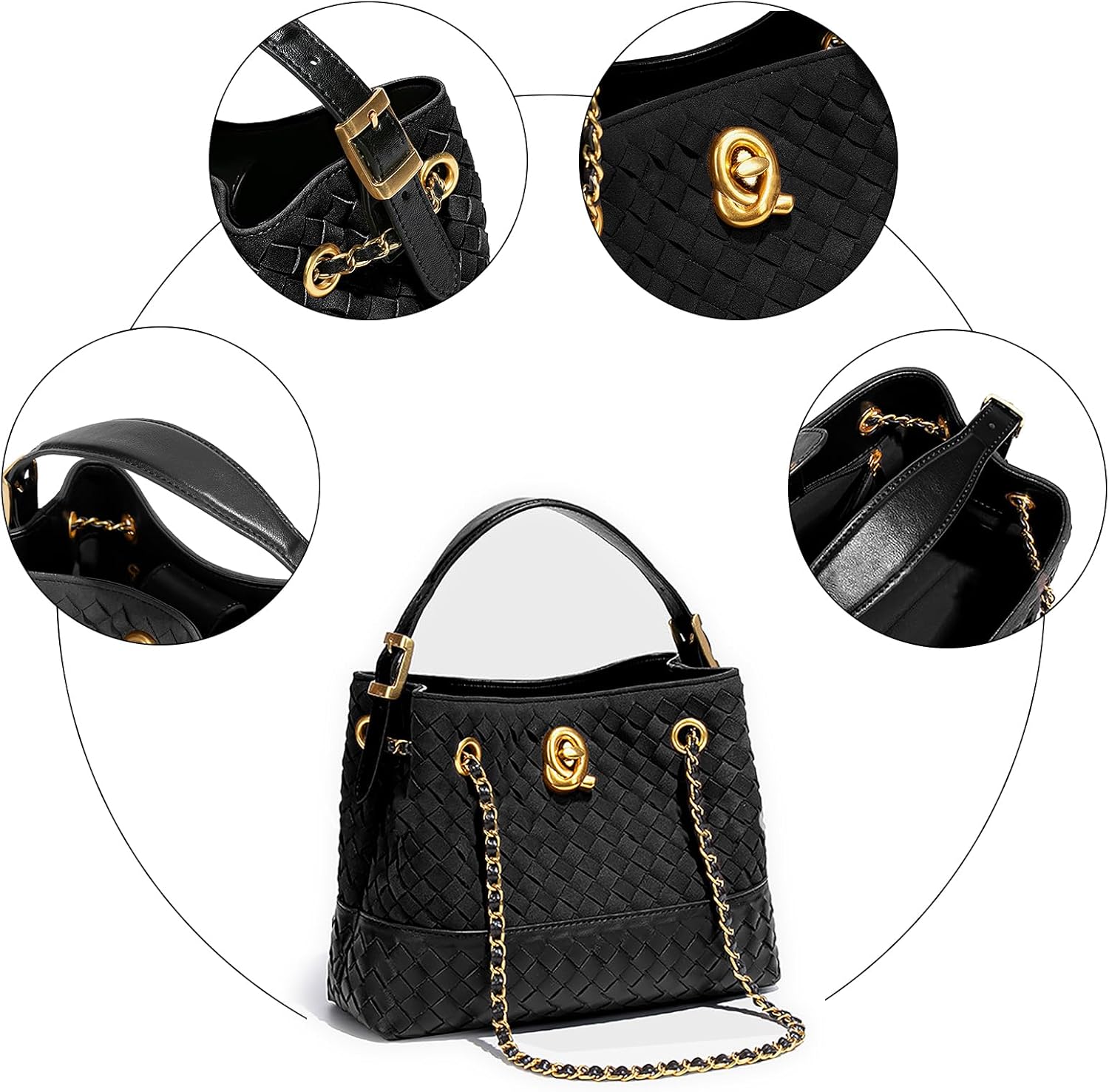 【Premium Material】This woven handbag is made of smooth vegan leather and soft suede, and plus the unique gold turn lock closure design makes the purse look more exquisite and elegant.【Trendy Handbag Size】At 9"x3.5"x7"(L x W x H)/23x9x18CM.Cute womens suede bag could hold essentials such as mobile phone, keys, makeup.【Internal pocket】This slouchy shoulder bag offers a spacious main compartment, an interior zipper pocket, and a patch pocket for storage,keeps your essentials organized and easily accessible.【Chain design】Exquisite chain and frosted woven material blend perfectly,not only retains the elegant temperament of the small satchel bags for women,but also adds fashion and personality, the length of the chain is moderate easy adjustment, whether it is an underarm bag, wrist bag, shoulder bag, crossbody bag or handbag, it can show different styles and make you easily become the focus in the crowd.【Gifts for Women】Women's purses and handbags pairs easily with all outfits in your wardrobe, handcrafted with exquisite elegance, making it an ideal present for yourself, mom, daughter, lover, and other female friends.