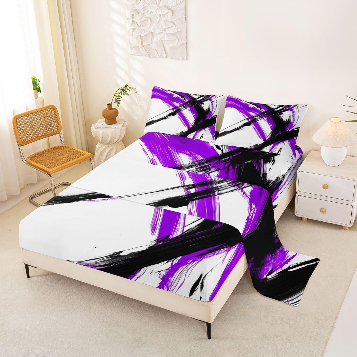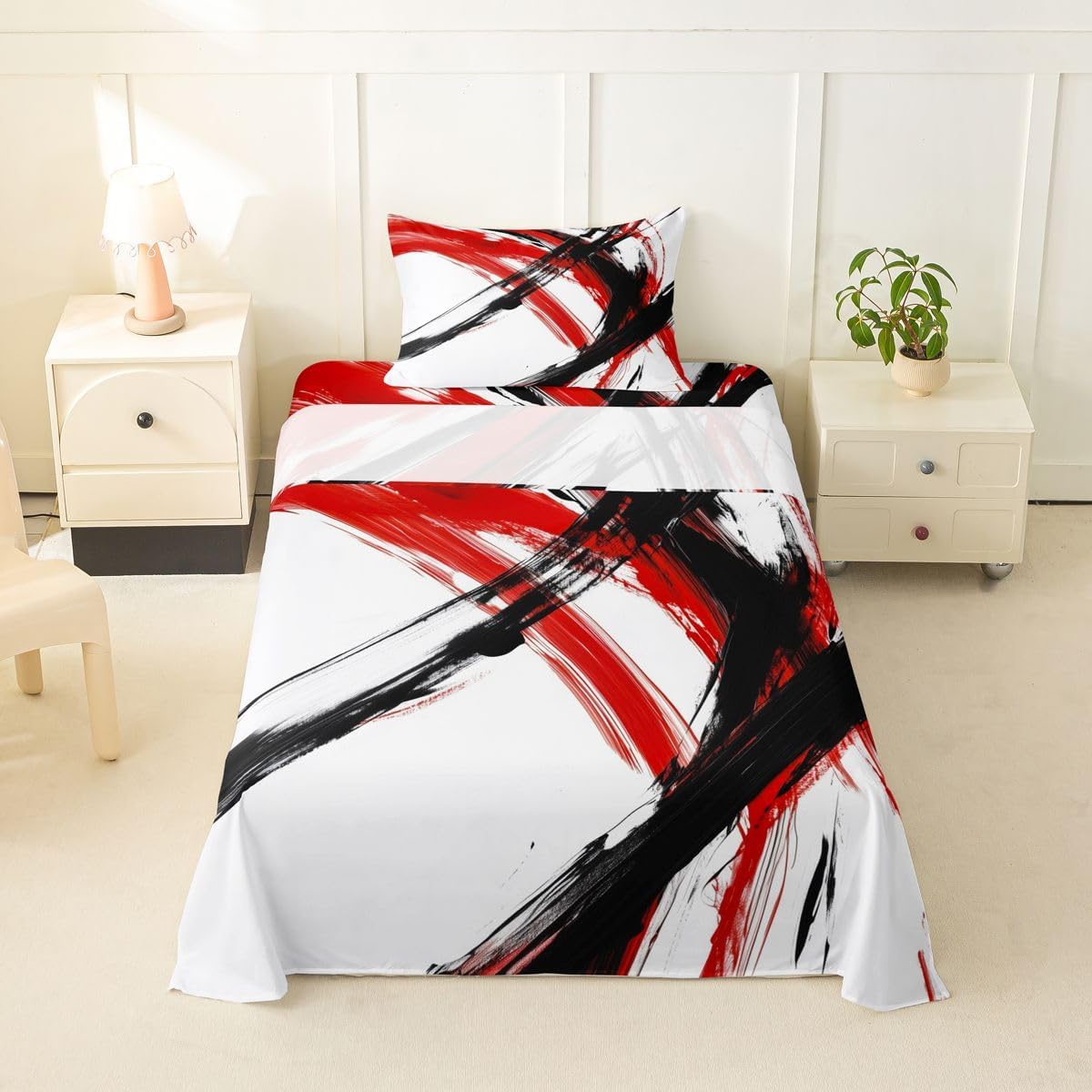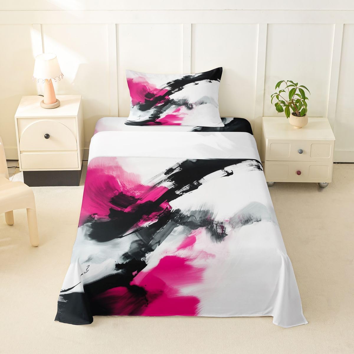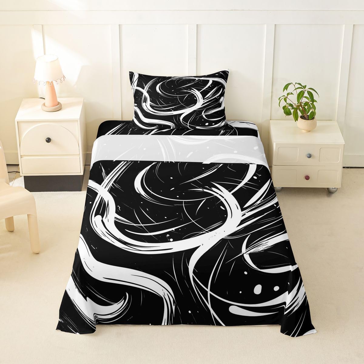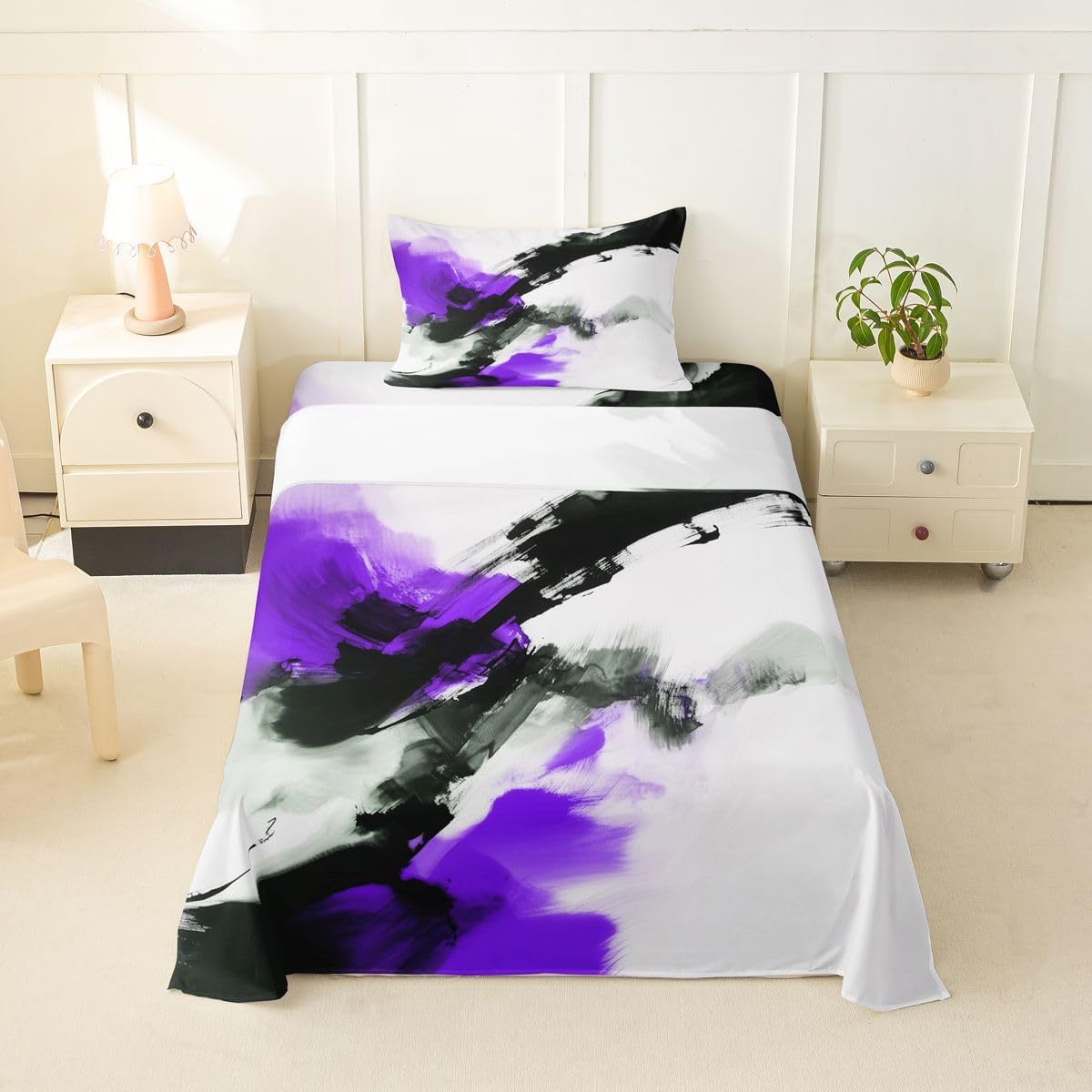 Our bed sheet is made of polyester fabric, lightweight and soft; stylish design is very suitable as room decoration for boys and girls; keep warm in winter and cool in summer; create a comfortable sleeping environment to make you fall asleep all night Range of size 1 twin fitted sheet 39 inch x 75 inch x 16 inch and 1 twin flat sheet 66 inch x 96 inch and 1 standard pillowcase 20 inch x 30 inch 1 full fitted sheet 54 inch x 75 inch x 16 inch and 1 full flat sheet 81 inch x 96 inch and 2 standard pillowcase 20 inch x 30 inch 1 queen fitted sheet 60 inch x 80 inch x 16 inch and 1 queen flat sheet 90 inch x 102 inch and 2 standard pillowcase 20 inch x 30 inch 1 king fitted sheet 78 inch x 80 inch x 16 inch and 1 king flat sheet 90 inch x 106 inch and 2 standard pillowcase 20 inch x 36 inch