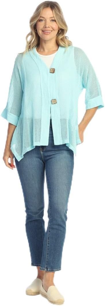 Mineral Washed Mesh Jess & Jane Cardigan - M116. Jess and Jane contemporary tops and tunics are designed with fabric details for comfort and style starting with a loose missy fit accented with artfully patterned color prints in a variety of colors and subtle shading many incorporating rhinestones in the title and images. These tops and tunics utilize a more generous cut of fabric and are all double stitched providing a smoother more comfortable fit that's sure to keep it good looks and sizing for a very long time. Water based inks provide a smooth, comfortable fit and allow the fabric to breathe easier than oil based inks. These are perfect tops and tunics to wear with jeans, shorts or dress pants basically functioning as a go anywhere, dress up or dress down classic causal fashion top that's easy to pack, light weight and extremely comfortable. Please note that the Jess and Jane tops, hoodies and tunics are uniquely styled and many are made for only one or two seasons which means once that style is sold out it is typically no longer available.