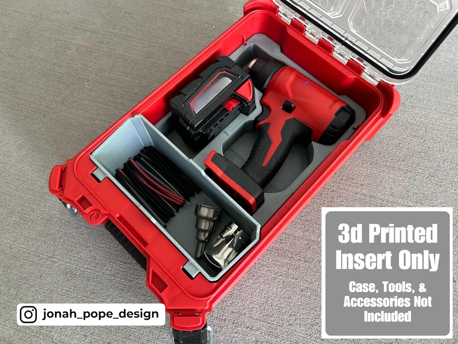 Insert only - Case and tools not included. Designed for the Milwaukee M18 Heat Gun (2688-20) and accessories. 3D printed from PETG material for higher strength and temperature resistance. Designed for Milwaukee PACKOUT 5-Compartment Organizer 48-22-8435. This includes the insert only. No other product is included. This product is 3d printed, which can result in minor surface imperfections.
