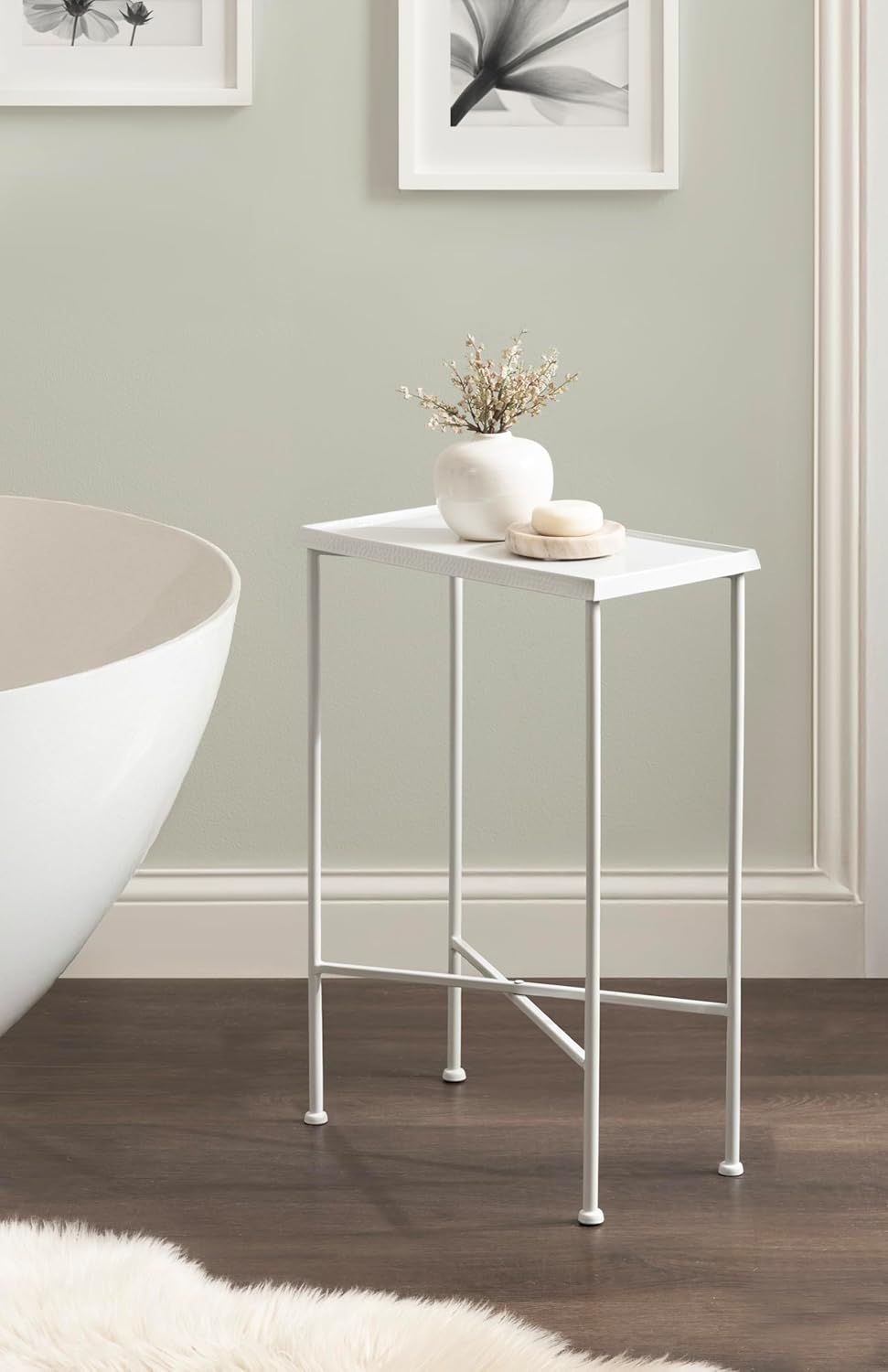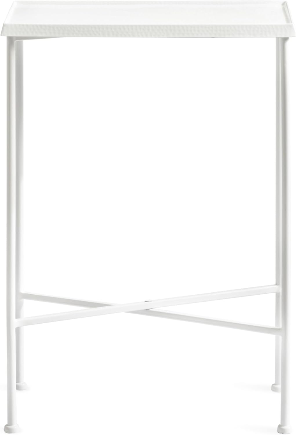 For the interior decorator with a passion for modern design comes our Sanzo narrow side table. The Sanzo collection features a solid iron construction with a hand-applied hammered texture crafted by artisans in India. Each table stands at 24 inches tall, ideal for placement next to your living room couch or bed. The tabletop's surface area is a perfect display or storage area for lamps, morning coffee, plants, alarm clocks, or other small items. Use it as a living room table, a slim nightstand in the bedroom, or an accent table near your bathtub. Regardless of where you put it, the Sanzo end table makes for a unique statement piece in any area of your modern home. Everything down to the glossy outdoor-grade white finish echoes timeless design and style. You won't have to work hard to set up this charming table, either; the Sanzo side table has a simple, three-step assembly process. The 16.5-inch width and 8.5-inch depth make this a charming indoor or outdoor plant stand option for some small succulents or your favorite house plant.