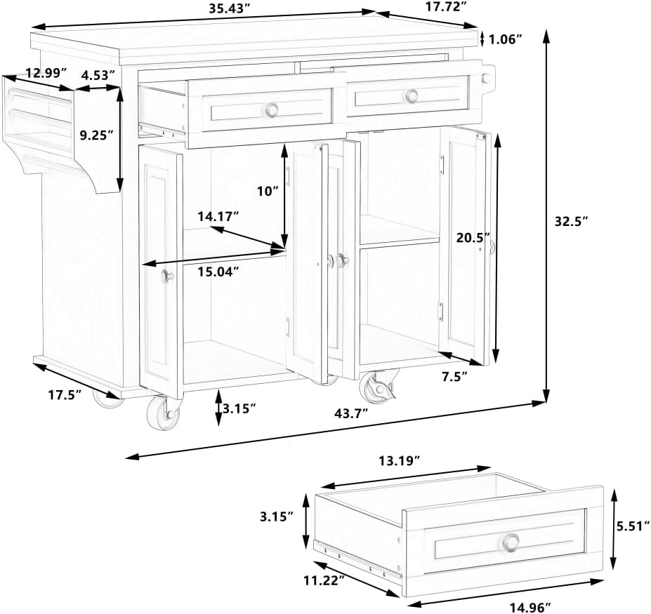 Item Code:W75732164 Product Type:General Item Main Color:White Main Material:MDF Versatile Design:This kitchen island features an aesthetic modern look and can be fit into the kitchen, dining room, and hallway in various styles. Materials:The kitchen island cart is made of high-quality solid wood tabletop and high-quality MDF, sturdy and durable, heat-resistant and moisture-proof, with a load-bearing capacity of up to 120lbs. Large storage space:Two storage drawers and adjustable shelve accommodate a variety of kitchen items.You can put small kitchen appliances and tableware into the cabinet and drawers to make your kitchen more neat and organized. Simple assembly required and dimensions:This kitchen island cart comes with step-by-step assembly instruction and numbered parts and hardware to make sure you can set up it without difficulties. Features This rolling kitchen island cart is a great way to combine everything you need in your kitchen, it is a good place to cook or to use as storage. Add more counter top space and storage space to your kitchen with this kitchen island. This island has four door cabinet,two drawers, and two lockable wheels. You can put small kitchen appliances and tableware into the cabinet and drawers to make your kitchen more neat and organized.Works well as a kitchen dining bar, hotel cart, kitchen bakers rack, microwave cart, or workstation. suitable to fit into the kitchen, dining room, and hallway.A handy spice rack provides convenience when preparing a meal on your cart.Moreover, big premium rubber-made wheels allow you to move on the ground without too much noise for better move. Notice: 1. Due to lighting or display, the color of the actual product may differ slightly from the image. 2. Manual measurement has been used, and there may be some reasonable errors.