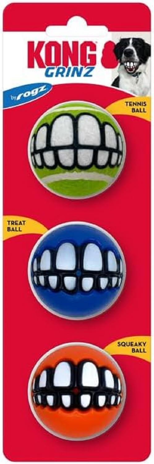 KONG Grinz Variety 3-pack is full of smiles, laughs, and fun! Each ball brings dynamic bounce and its own style of durable texture. Including one squeaky ball, one tennis ball, and one treat ball that you can stuff with your favorite KONG treats, all of them have the classic Grinz teeth for purely playful entertainment!
