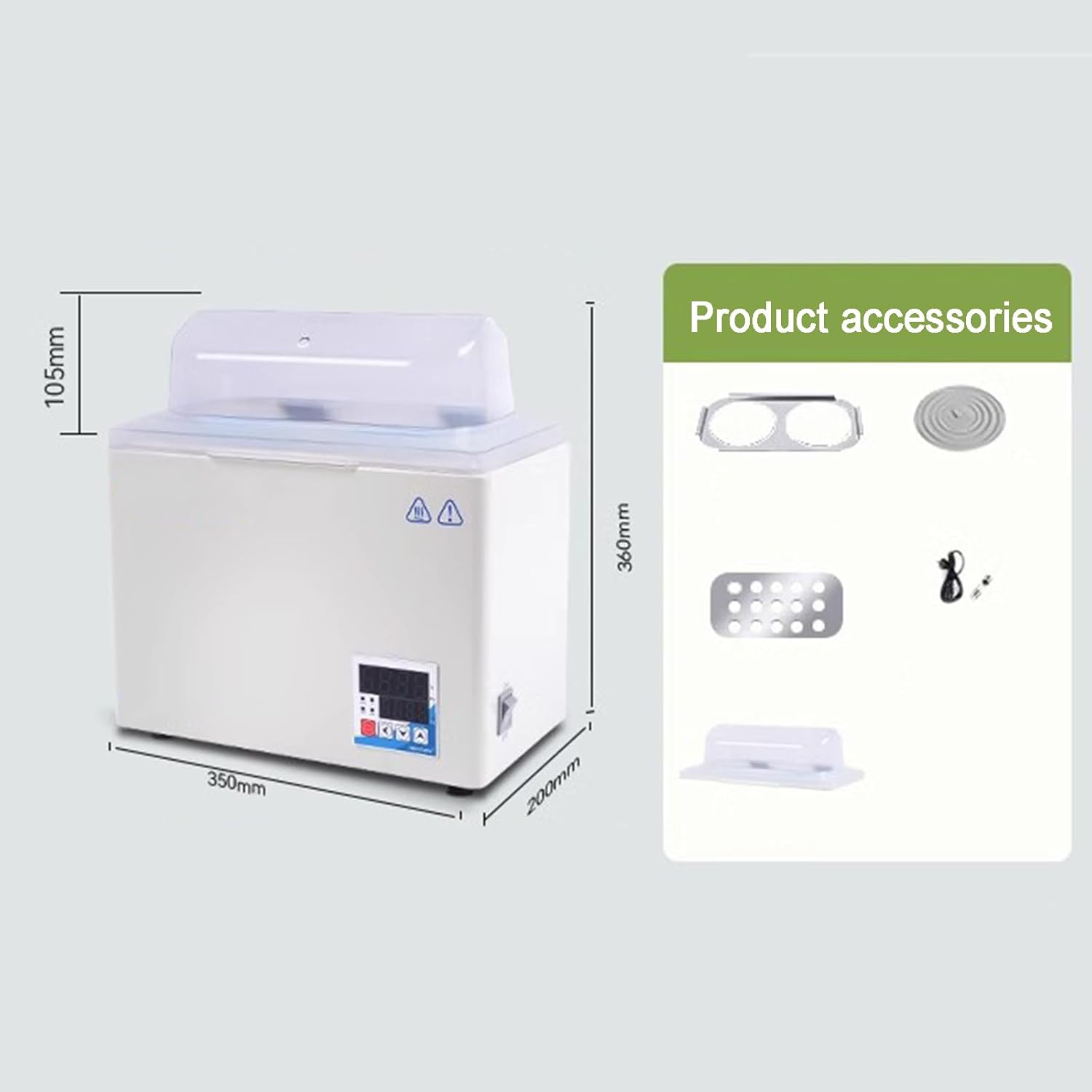 The water bath temperature can be set freely, making the experiment easier 360° circulatory heating, and constant temperature experiment Specifications: Power: 600w Control range: RT+5-100℃ Constant temperature fluctuation: ±0.3℃ Water tank capacity: 8L Timing (timing): 1-5999min Working hole: 2 holes Opening cover diameter: 97/77/59/39mm Internal storage space: 300x150x105 External dimensions (length, width and height): 350*200x360 (mm) Internal height of lid: 105mm Built-in: hidden drain outlet