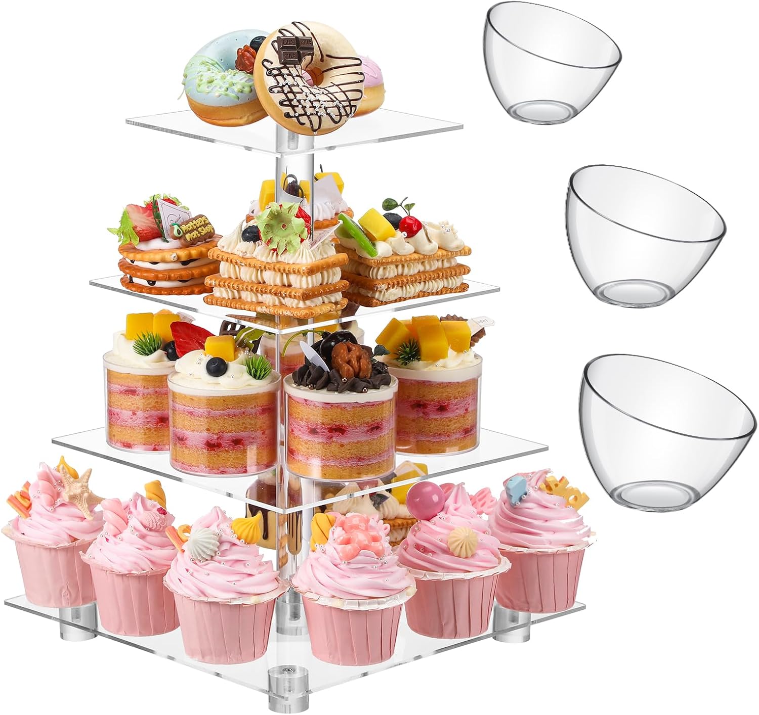 Features: Crafted from acrylic and plastic, this versatile set exudes delicate with its clear, modern aesthetic. Ideal for enhancing the appeal of your desserts or salads, these salad bowls and cupcake stands make a sophisticated addition to any event, be it a birthday party or a wedding celebration. These acrylic and plastic serving pieces are not only aesthetically pleasing but also durable and easy to clean. Specifications: Material: acrylic, plastic Color: clear Size: Serving bowls: 0.7L, 1L, 1.3L Cupcake stand: acrylic plates with 4 inches distance between them Package includes: 2 x Cupcake stand 4 x Serving bowls Notes: Manual measurement, please allow slight errors on size. The color may exist a slight difference due to different screen displays.