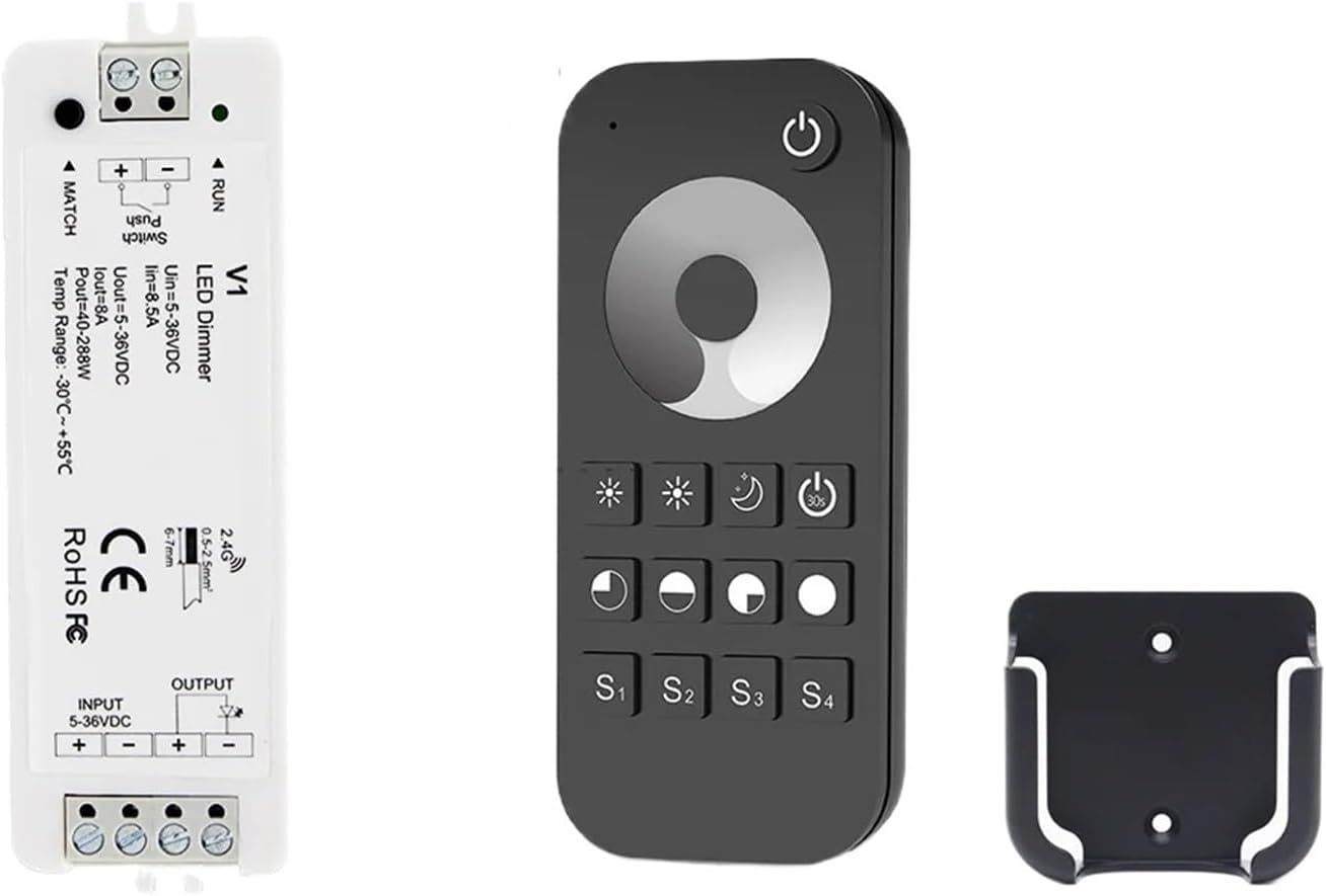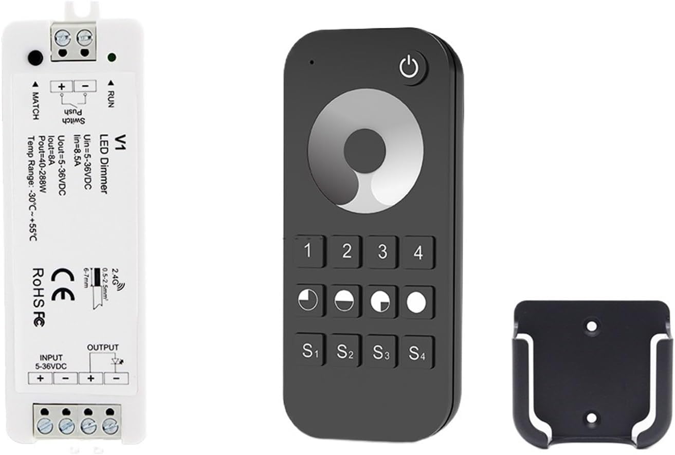 ControllersDimmersfeature:Remote control or connect external push button switch for on/off and dimming functionsUltra-sensitive brightness adjustment touch slideDimming smooth switching no flickeringAutomatic transmission function: the controller automatically transmits signals to another controller with a control distance of 30mSynchronize across multiple controllersThere are magnets on the back so it can easily stick to the back stand or any metal Matching remote control:The end user must pair the remote control with the receiver before use. The steps are as follows:*** Matches:Short press the match key and immediately press on/offThe remote's zone keys (single-zone remotes) or zone keys (multi-zone remotes).LED indicator flashes quickly several timesIt means the match is successful.*** delete:Press and hold the match key for 5 seconds to delete all matches The indicator light flashes 5 times to indicate that all matching remote controls have been deleted.The main function:One V1 receiver can control up to 10 remote controls within a distance of 30mAutomatic launch:One receiver can transmit the signal of the remote control to another receiver within 30m range As long as there is a receiver within 30m the remote control distance can be unlimited.Automatic synchronization:Multiple receivers can work synchronously when controlled within a distance of 30mvia the same remote control.Receiver placement provides communication distance up to 30m. However we recommend for indoor applicationsThe distance between receivers should not exceed 15m.RT1 can only control all areas that work synchronouslyRT6/RT8 can control all areas that work simultaneously and independentlyV1 receiver and RT1RT6/RT8 (transmitter):RT1 / RT6 / RT8 functions:How to connect a longer LED strip?1 V1 LED dimmer can control up to 12V 96W LED strip