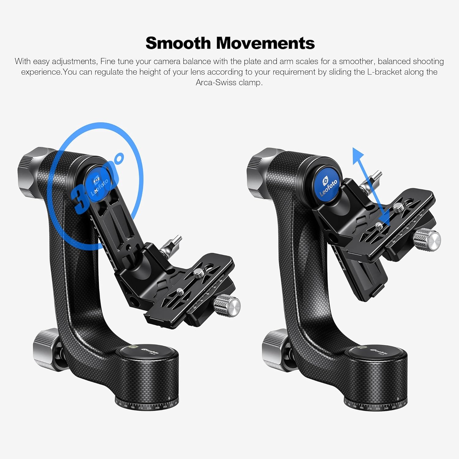 Durable Material: PG-3 products are made up of 10 layers of carbon fiber, which is characterized as tough, durable and waterproof, and can withstand up to 25 kg /55.12 pounds of weight, while the total weight is only 1.2 kg /2.65 pounds3/8" Threaded Hole: The base of the PG-1 features a standard 3/8"-16 threaded tripod adapter. Additionally, there is a 1/4"-20 socket on the side of the arm for mounting various accessoriesArca QR Plate and Clamp: Compatible with Arca-style quick release plates, this model offers an adjustable height range of 100 mm to facilitate balanced positioning of telephoto lenses. Scales are printed on the side of the swing arm to simplify the replication of future setups360° Pan Rotate: The base of the head allows for 360° pan rotate shooting and also comes with a levelling bubblerApplicable Occasions: Suitable for use with cameras, DSLRs, camcorders, and other devices, this product is particularly ideal for outdoor bird photography and wildlife photography