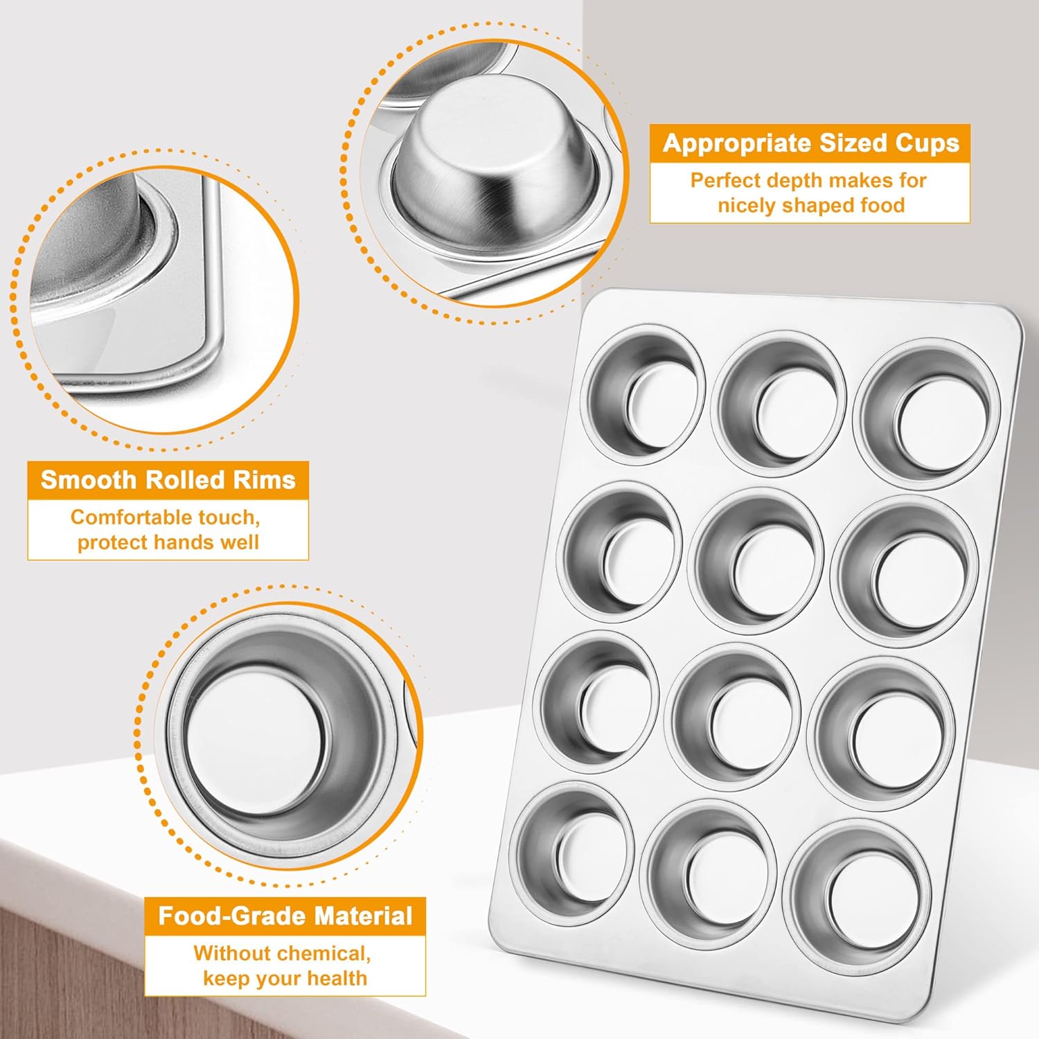 Excellent design, rolled rims provide comfortable hold and protect your hands from hurting, let you flexible work during baking, muffin cupcake tray with a matte finish surface, it comes off food effortlessly and without any sticking, put them into the dishwasher can help you save labor Multi-purpose muffin tray, this muffin bakeware set is perfect for cupcakes, brownies, bacon egg vegetable tarts, blueberry pie, quiches, pudding, jelly, cheesecakes, egg custard and other delicious desserts, Ideal gift for baking enthusiast Well design, one piece design are leak-proof and added versatility, with 2 inch deep side to hold more batter without spilling, keep your oven clean, smooth and rolled edges offers comfortable grip, stackable design to save space