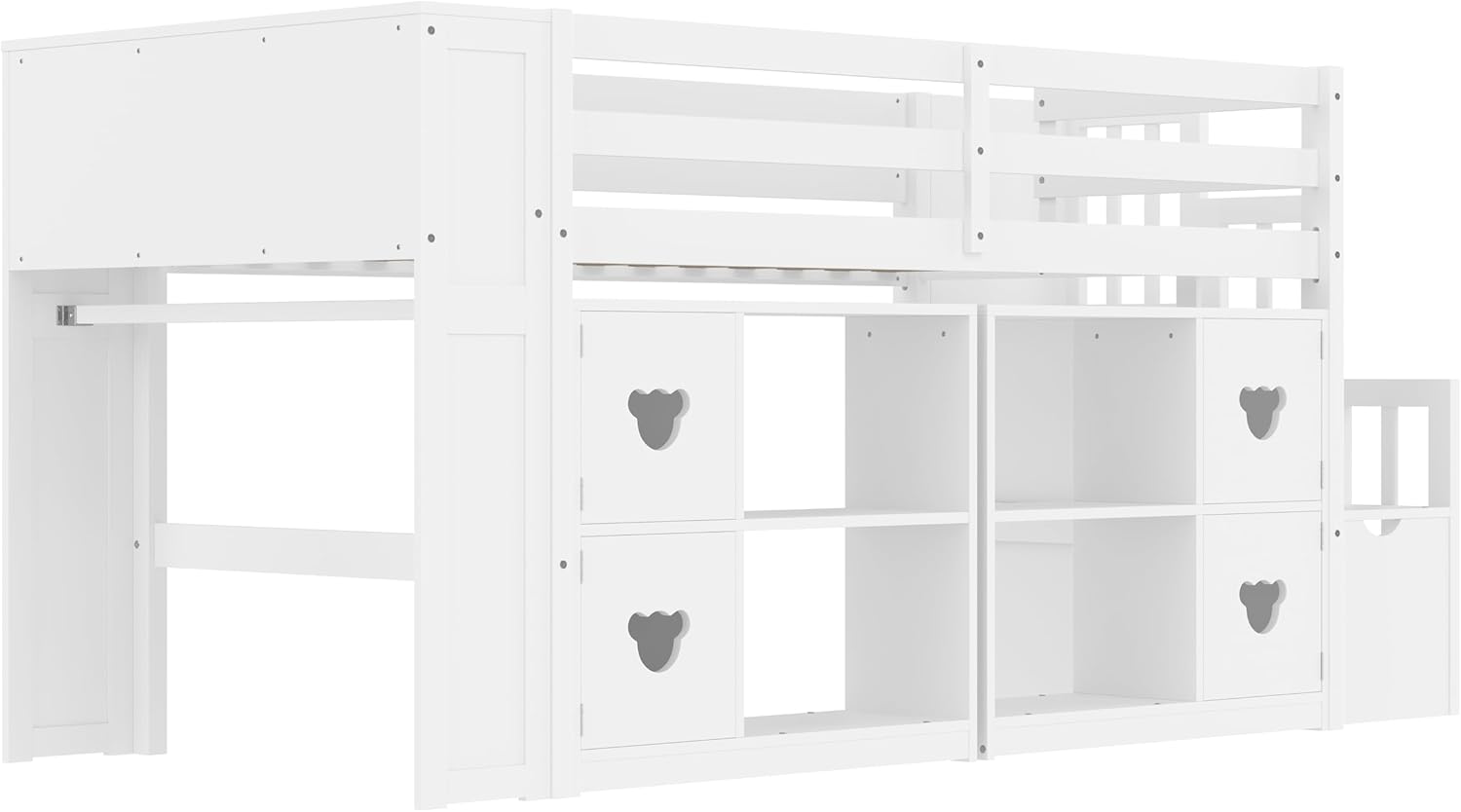 Kids Loft Bed with LED Lights & Storage – Low Loft Bed Twin Size with Stairs, Safe & Sturdy Twin Size Loft Bed for Kids This low loft bed not only comes with storage, but also gives your child a safe space to sleep and a fun space to play! The upper level serves as a sleeping bed, while the lower level features open shelves and storage cabinets, maximizing space utilization. Moreover, the staircase is integrated with drawers, providing additional storage space. This low loft bed with storage is also designed with Built-in LED Lights, adding a fun, customizable glow to your child’s space with seven vibrant colors to choose from. Description & Dimensions Size:Twin Color: White/Natural Product Dimensions: 102.6"L x 42.2"W x 44.5"H Product Weight: 213.9LBS Materials : Solid Pine+MDF+Plywood Weight Capacity: 200LBS Recommended Mattress Thickness: 6 inch, mattress not included Number of Slats: 14 pcs Numbers of Package: 2 Box Spring Required: No Country of Origin: Viet Nam Remark: Different lighting or display will cause color difference.