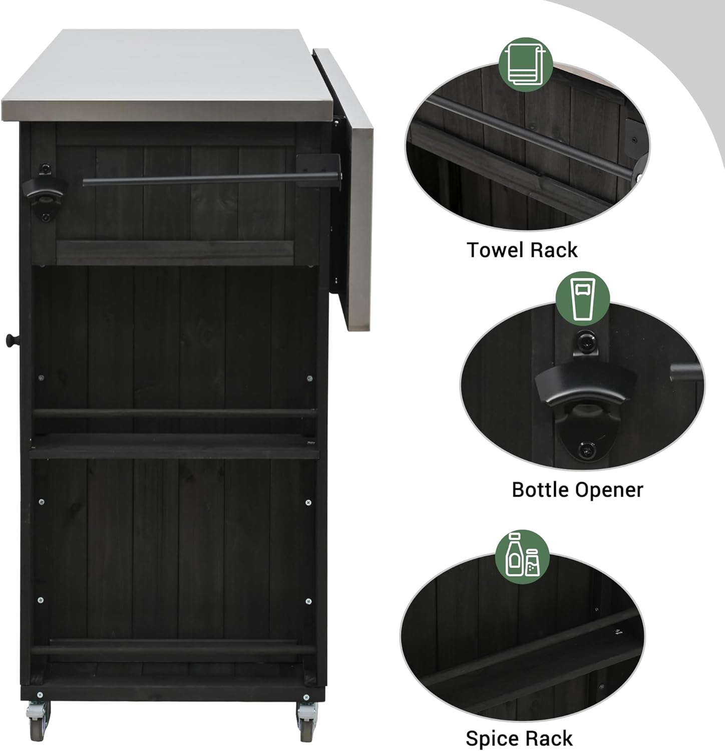 Description Enhance your kitchen with this stylish and functional kitchen island. Made from fir wood and stainless steel, it offers a natural finish that complements any décor. With a spacious tabletop, open compartment, and shelf, it provides ample storage and organization for your cooking essentials. Features Type: Kitchen Island Color: Black Material: Fir Wood + Stainless Steel Finished Back: Yes Assembly Required: Yes Package Number: 1 Dimensions & Weight Overall Dimension: 52.25''L x 28.75''W x 36.25''H Product Weight: 80.25 lbs Tabletop Weight Capacity: 400 lbs Open Compartment Capacity: 200 lbs Shelf Weight Capacity: 55 lbs Spice Rack Weight Capacity: 22 lbs