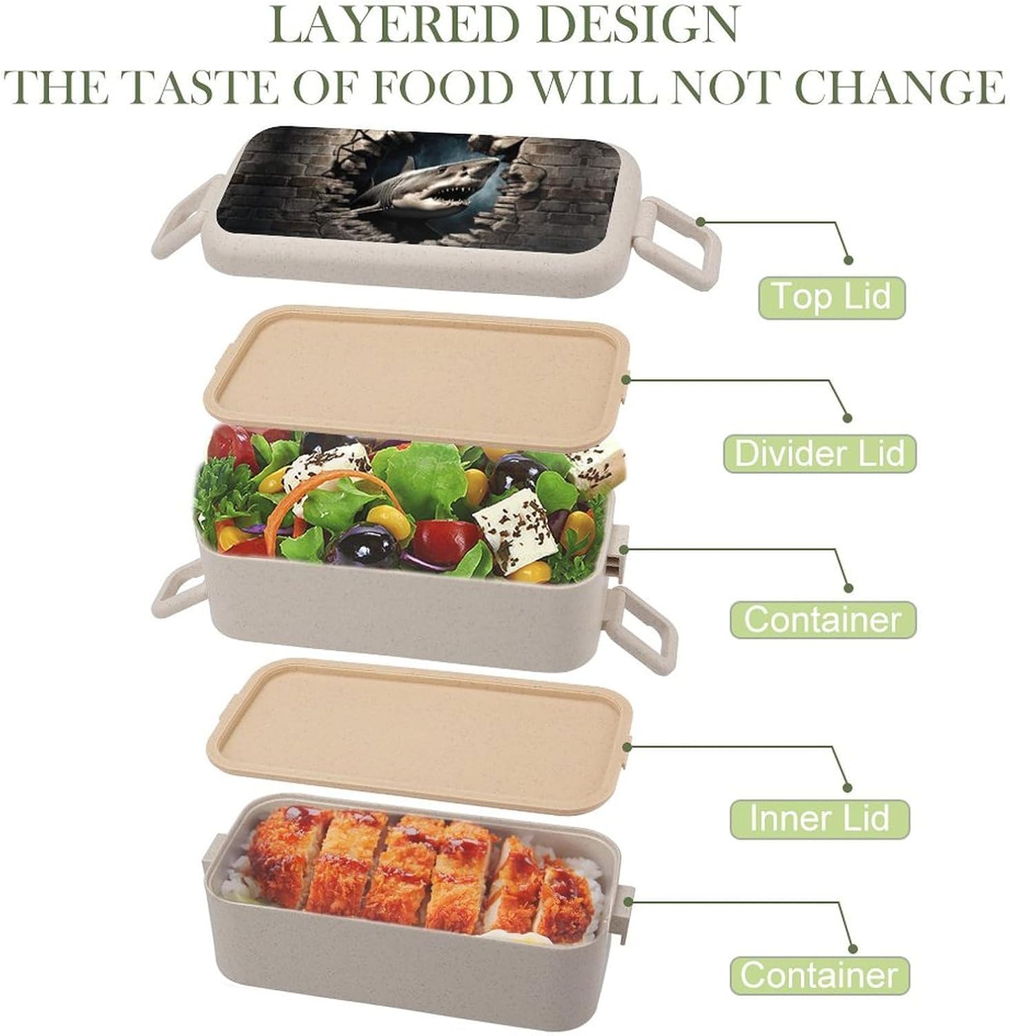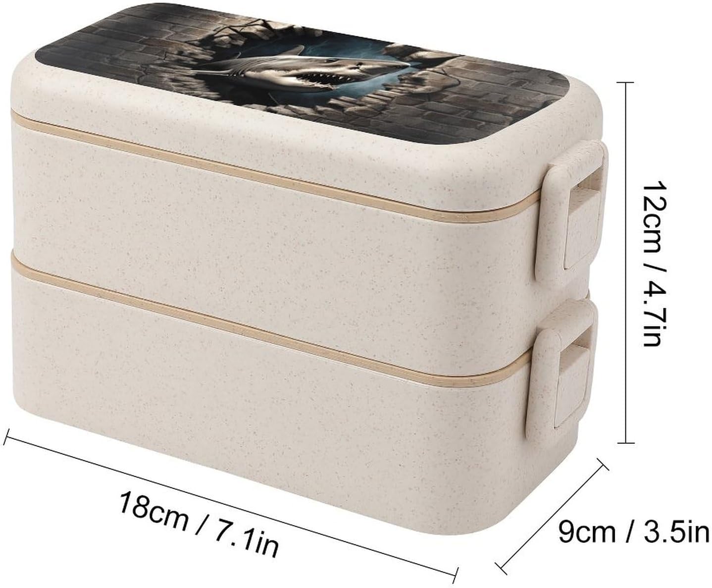 Fruit lunch box The food container is made of selected wheat fiber material,which will not emit other odors due to high temperature.It is a good helper for your daily life.The Shark Through Wall printed food container adopts a partition design,which can separate different types of food,maintain the original flavor of the food,and plan your meal time reasonably.Integrated lunch box Small size and light texture,it will not feel bulky when put in a handbag or backpack during commuting.Portable lunch box The sealed design can reduce the possibility of accidental food spillage and odor escape,providing convenience for your dining.Travel snack box In addition to accommodating staple foods and side dishes,the large capacity can also be used to place other foods such as fruits and vegetables.Bento box set Washable and reusable.