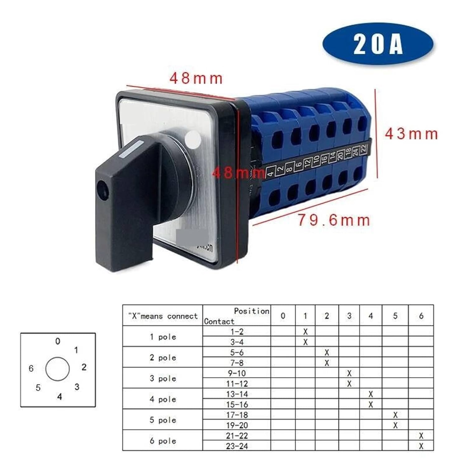 Knife SwitchesModel Number: LW26-20/6Position: 3 (1-0-2)Pole Number: 6 LevelsCurrent: 20AUi: 660VContact Material: Silver Contact Model Number : LW26-20/6Color : Blue/BlackUi Voltage : 660VRated Current : 20ATeiminal Number : 24 ScrewsPosition Number : 3 PositionsMounting Size : 48mmSection Number : 6 Poles