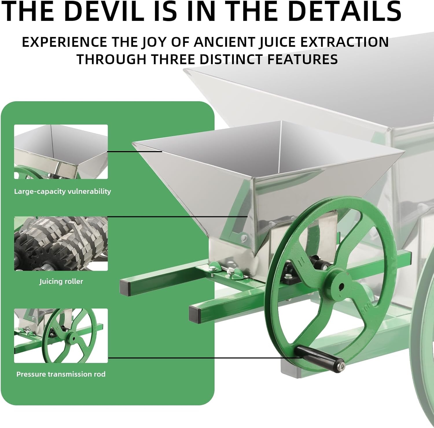 | Special Features | Heavy Duty Juicing Roller, Large Capacity Hopper, Manual Hand Crank Operation, Pressure Transmission Rod, Stainless Steel Construction |