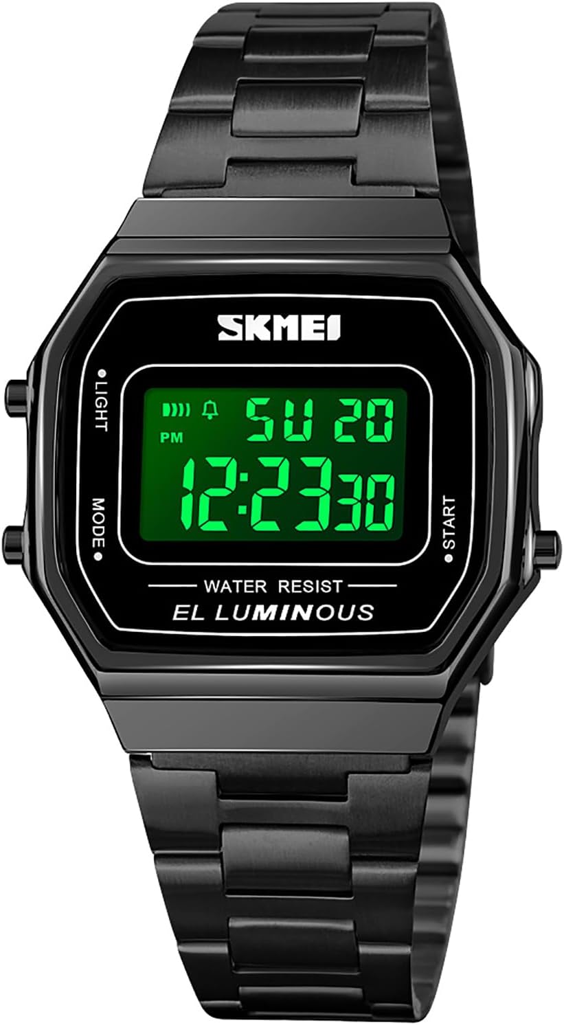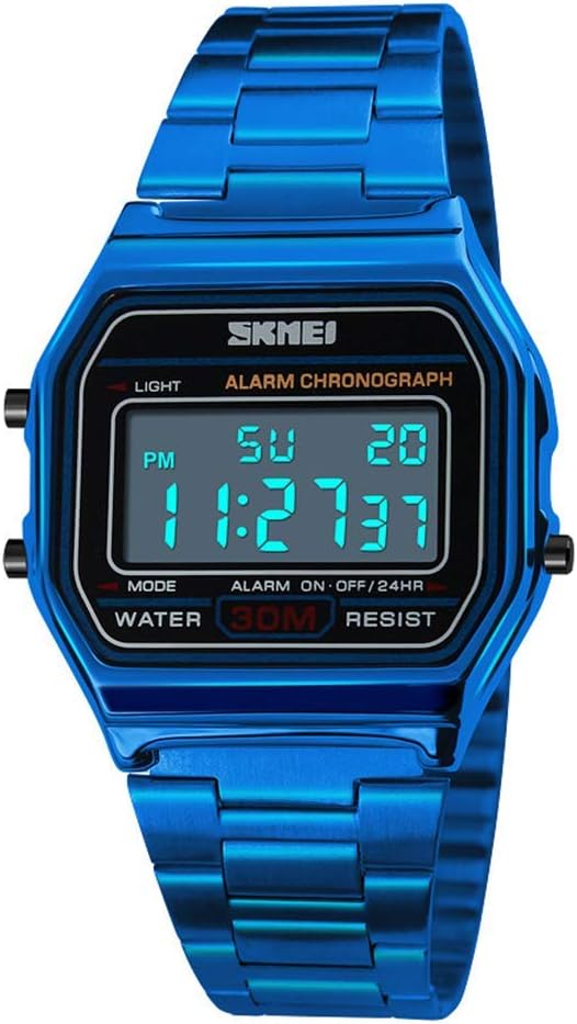 Highlights: Imported Digital Electronic Movement: provide precise and accurate time keeping Key Scratch Resistant Watch Face 12/24H Military Time Chronograph 1/100 Second Stop Watch Can See Time Clearly in The Dark With Back-light Calendar, Month, Date, Week Day Alarm and Hourly Chime (SIG, Beep Sound) Stainless Steel Case and Watch band 3ATM Waterproof: 30 M Material: Case Material: Stainless Steel Band Material: Stainless Steel Mirror Surface: High Hardness Resin Glass Specification: Dial Case width: 3.3cm Dial Case Thickness: 10mm Band Length: 23.5cm Fit Wrist: 16-22cm, 6.3-8.7inch Band Width: 1.5cm **NOTE**: Watch Face may covered by a protection film, please remove it before use. Please DONOT Press Any Buttons Underwater. Also avoid the use in extreme hot or cold temperature. Clean the watch face and strap by a soft cloth on regular bases is highly recommended. Too much water contact will shorter watch life. What Is In The Package: Sport Watch x 1 Instruction Manual x 1