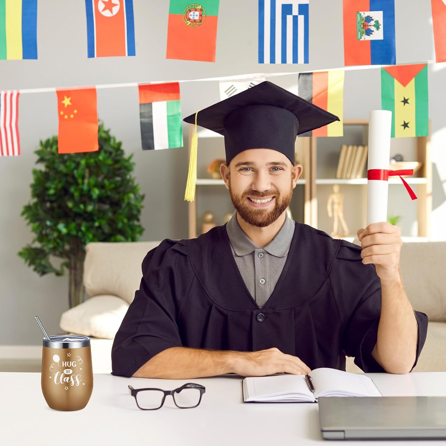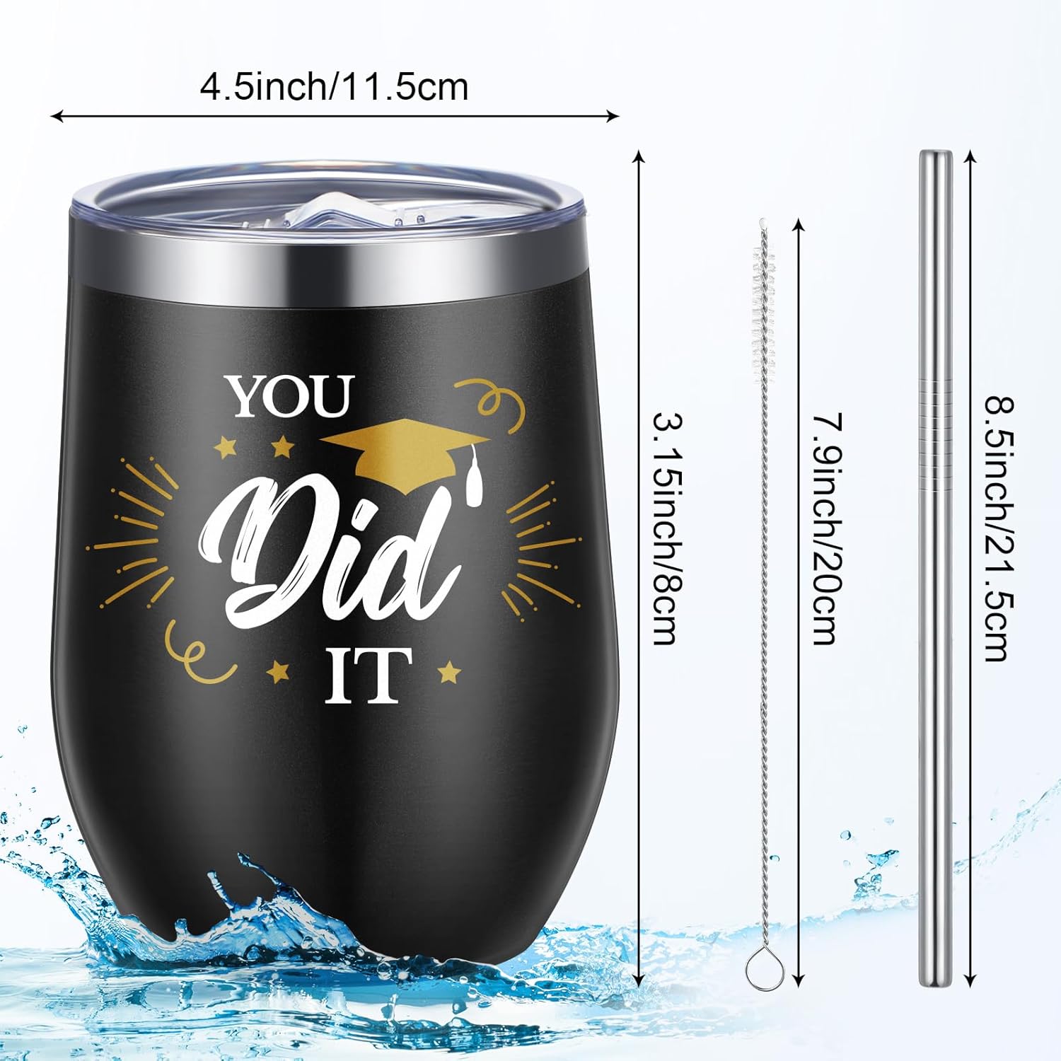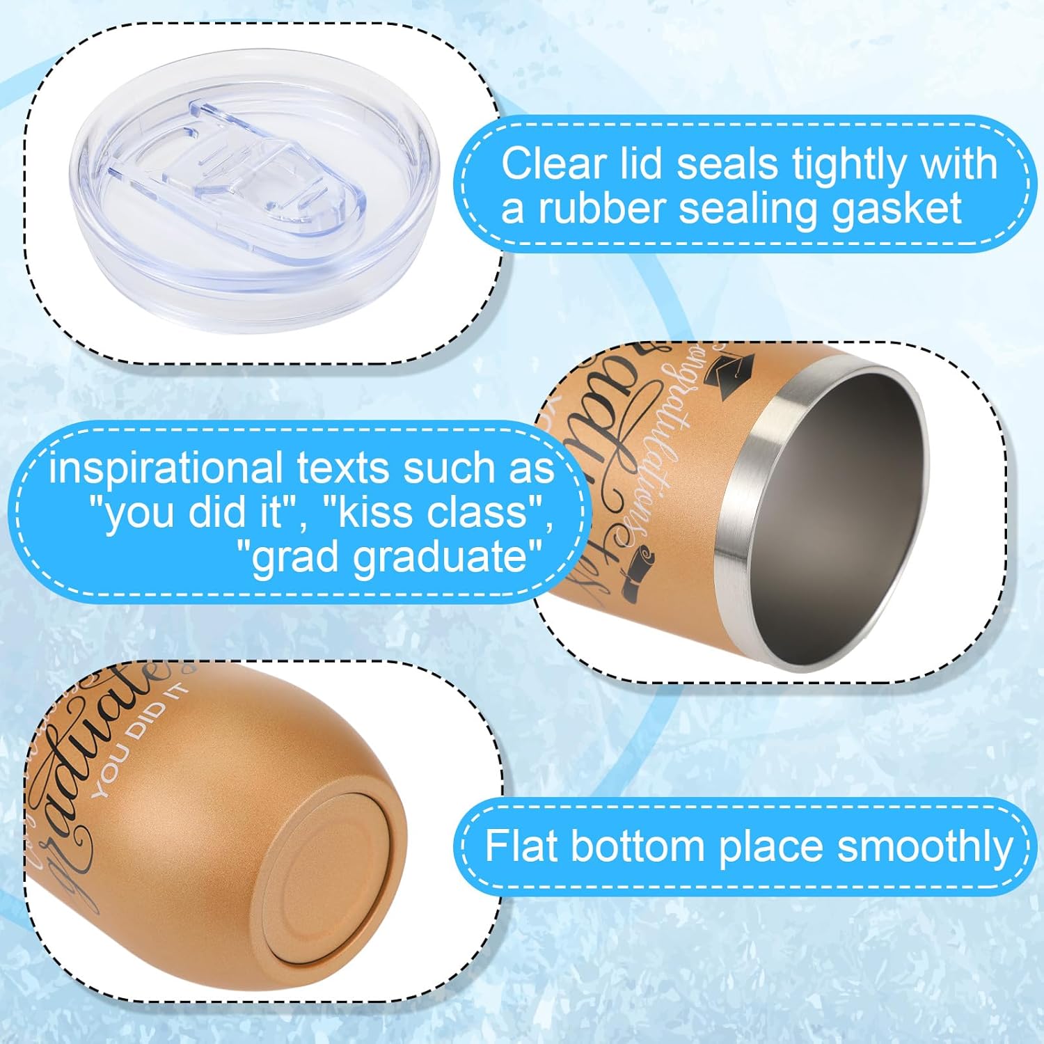 Features: Graduate gifts: Graduate stainless steel wine tumbler set is more suitable for graduate students in high school and college ceremonies. Vivid colors and patterns: Colorful words and graduation hat patterns, and more, meaning to bring a happy mood to the student. Various application ways: The stainless steel wine tumbler is suitable for wine, beer, cocktails, champagne, water, coffee, tea, milk, juice, and more. Specifications: Material: 304 stainless steel Color: as shown in the pictures Capacity: 12 oz Package includes: 24 x Graduate tumblers (12 oz) 24 x Straws 24 x Cleaning brush 24 x Lids Notes: Manual measurement, please allow slight errors in size. The color may exist a slight difference due to different screen displays.