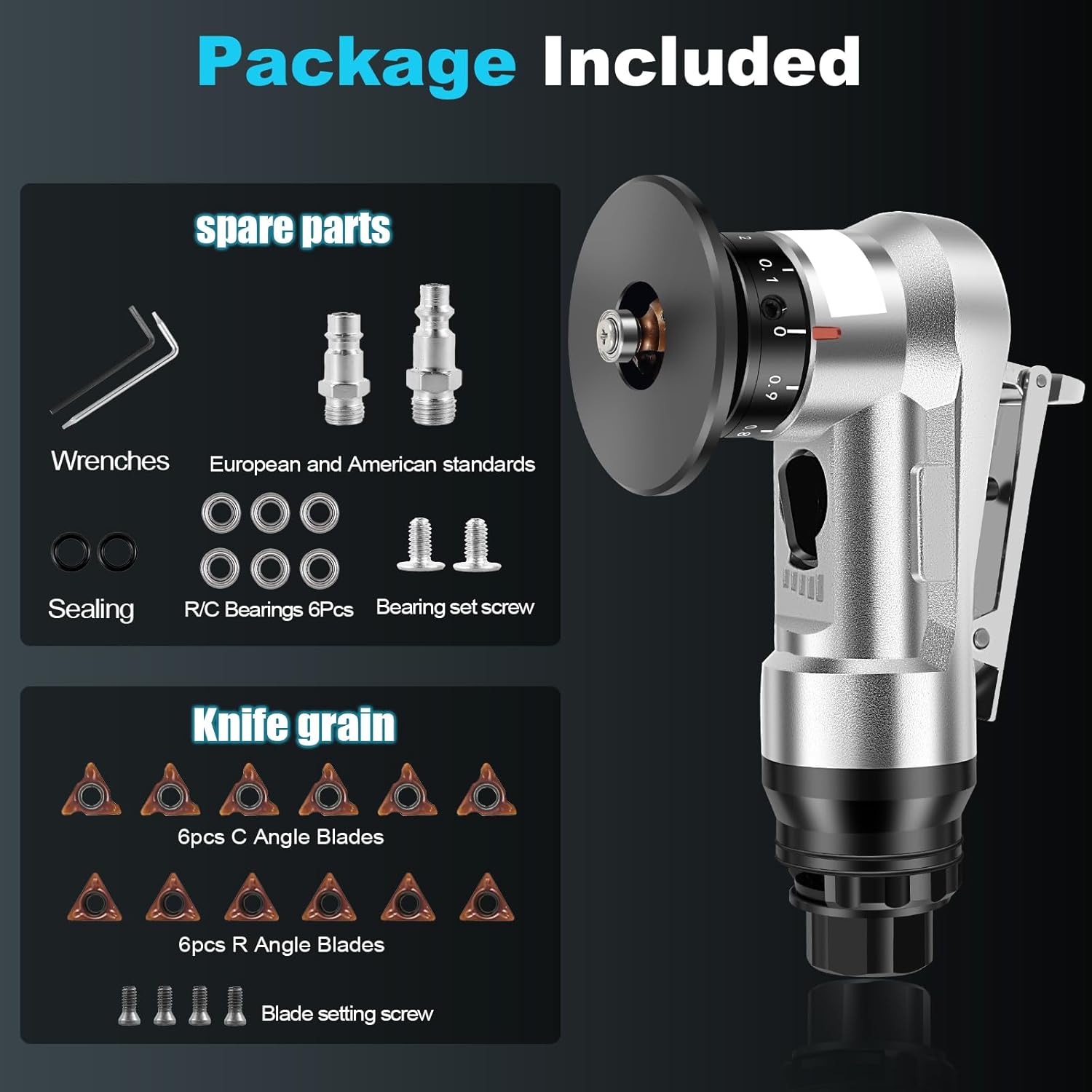 Parts List: Style 1:1 x Silver Pneumatic Chamfering Machine2 x Bearing Fixing Screw4 x Blade Fixing Screw6 x C-angle Blade6 x R1.5 Blade6 x Bearing1 x European Standard Connector1 x American Standard Connector2 x Wrenches2 x Seals1 x Instruction ManualORStyle 2:1 x Silver Pneumatic Chamfering Machine1 x Bearing Fixing Screw2 x Blade Fixing Screws2 x C-angle Blades2 x R1.5 Blades2 x Bearing1 x European Standard Connector1 x American Standard Connector2 x Wrenches2 x Seals1 x Instruction Manual Product Specification: DescriptionThe pneumatic chamfering machine adopts a new lightweight design and can be easily operated with one hand. The chamfering size can be adjusted freely. The speed of the gear can be freely adjusted and it is widely used for chamfering a wide range of materials such as metal and wood. Key FeaturesSafe to Use: The safety switch prevents accidental contact and protects the user's safety at all times. Easy to Operate: This mini pneumatic chamfering machine is lightweight and easy to operate with one hand for quick deburring. SpecificationProduct name: Pneumatic Chamfering ToolMaterial: Aluminium alloySize: 15 x 5.8cmDisc: 4.8cmBody diameter: 3.2cmConnector: about 4cmspeed: 30000RPMAir consumption: 0.4/minAir inlet: 1/4 inch PTEdge cutting capacity: Chamfer: C0-C2. 0, adjustable depth: 0.1mm-0.9mm.Chamfering: R0-R1.5Chamfering hole diameter: ≥8mmColor: SilverStyle(optional): Style 1, Style 2 Notes:1.There may be slight differences between the picture and the actual color of the commodity. We will try our best to show you the exact color.2.Please allow slight dimension difference due to manual measurement.